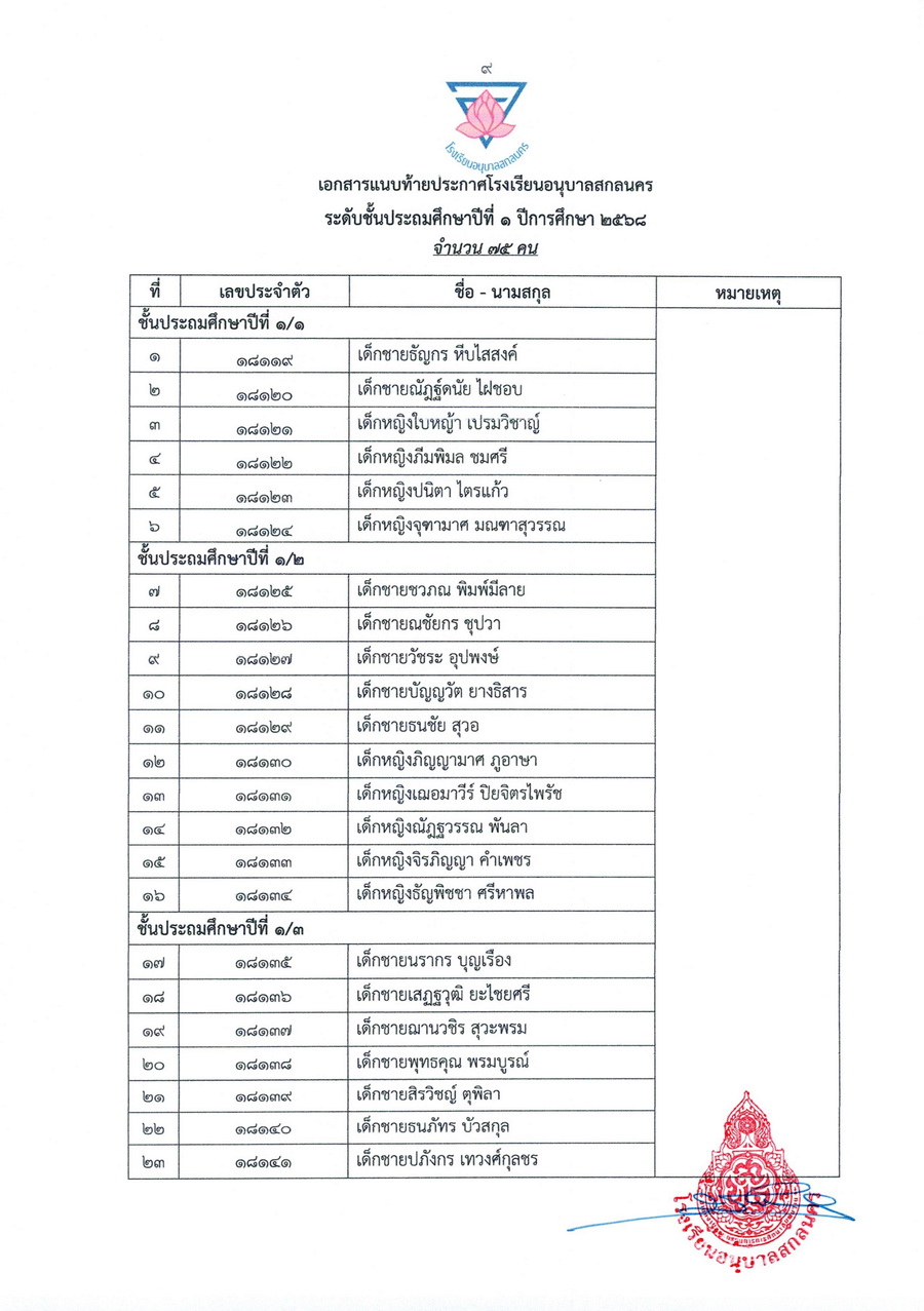 ประกาศเลขประจำตัวนักเรียนเข้าเรียนใหม่ ในปีการศึกษา 2568