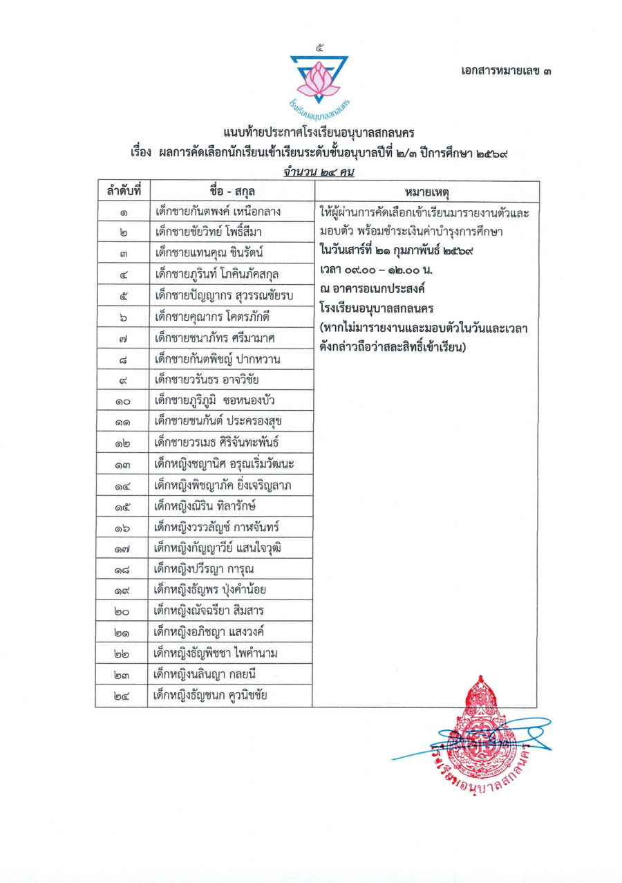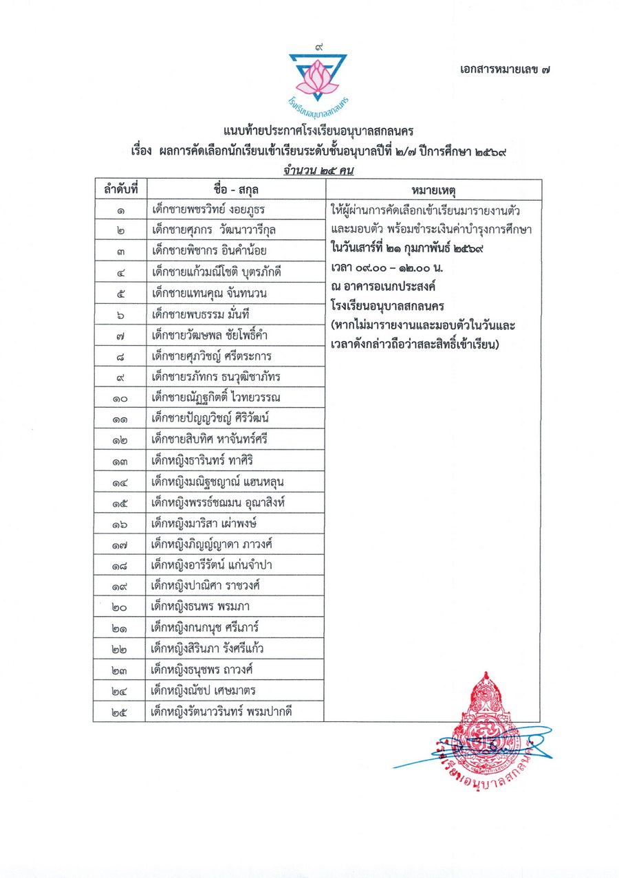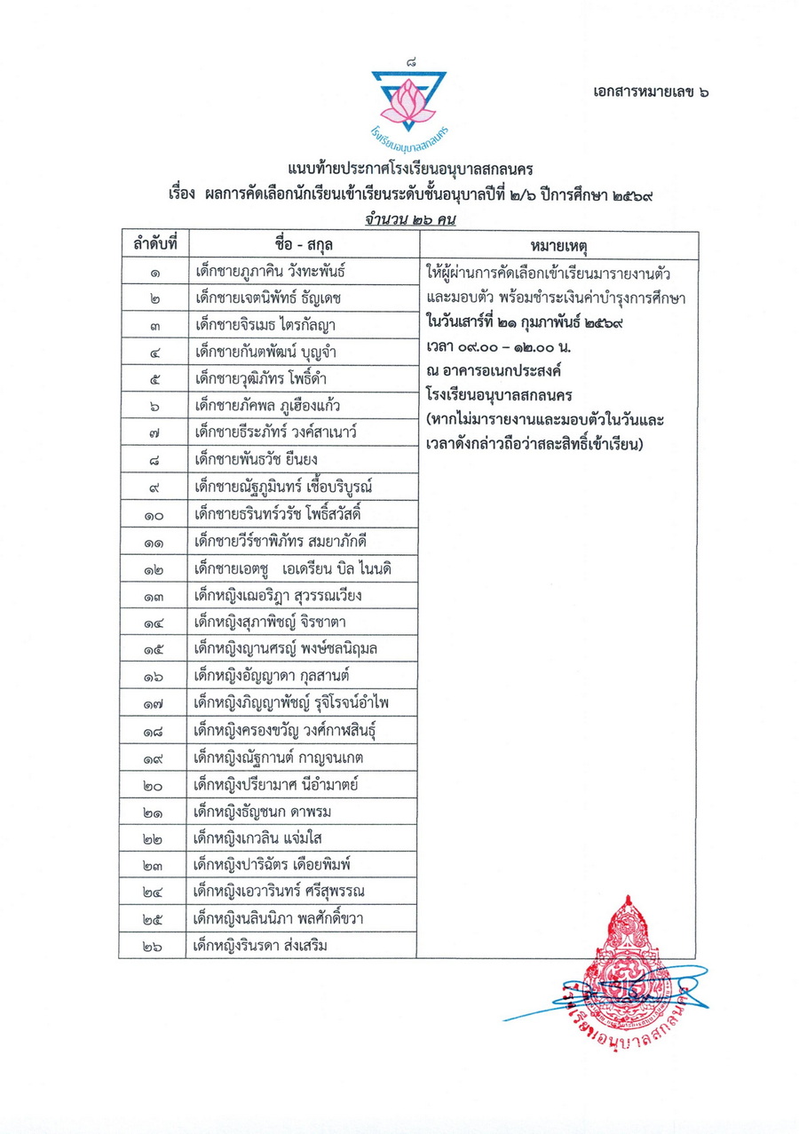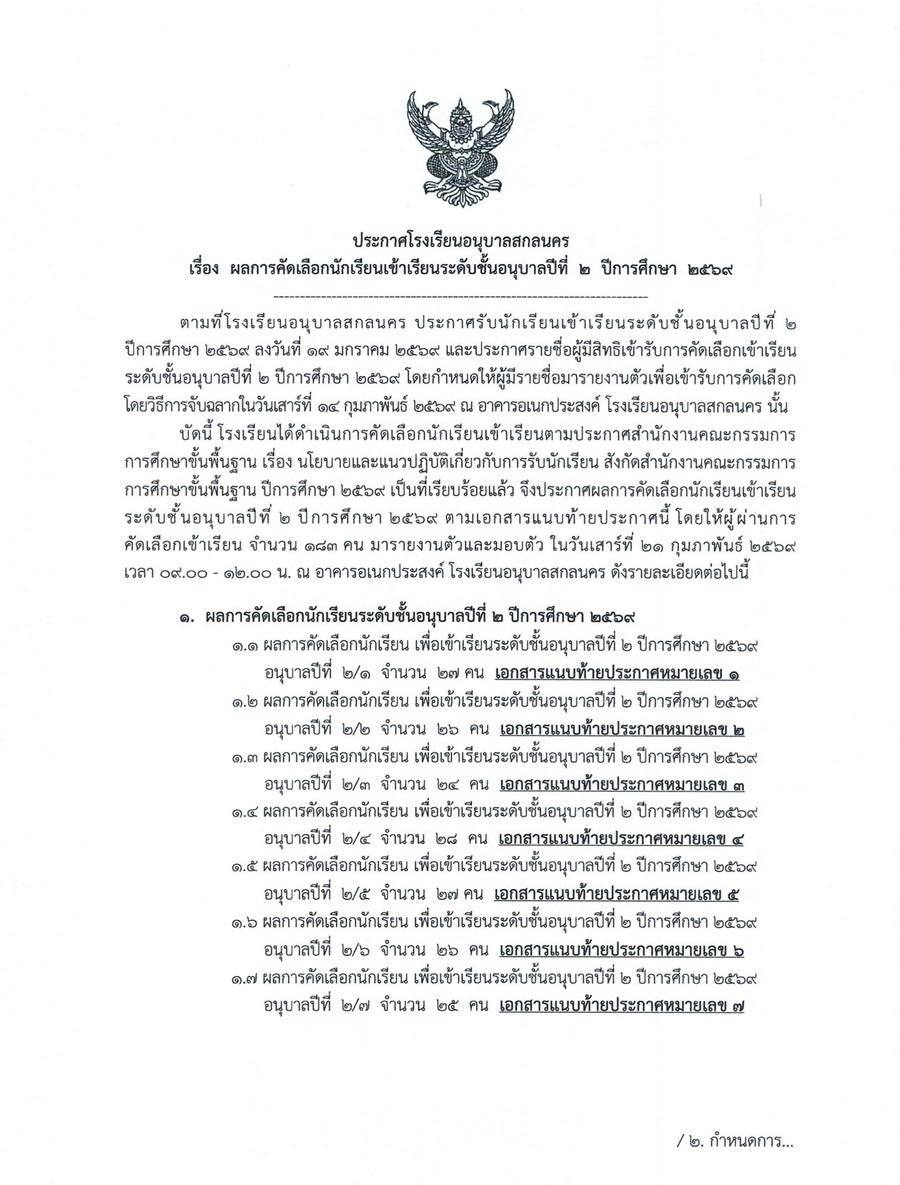 ประกาศผลการคัดเลือกนักเรียนชั้นอนุบาลปีที่ 2 ในปีการศึกษา 2569