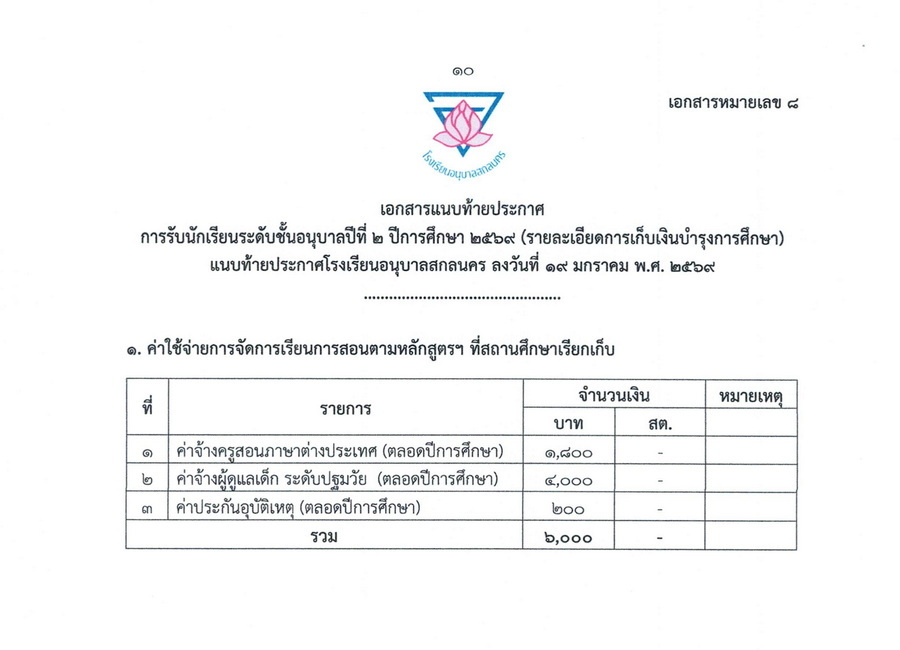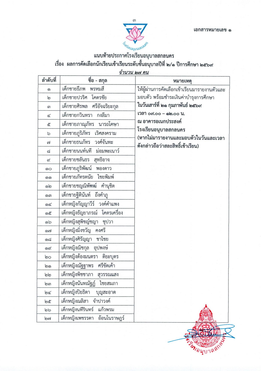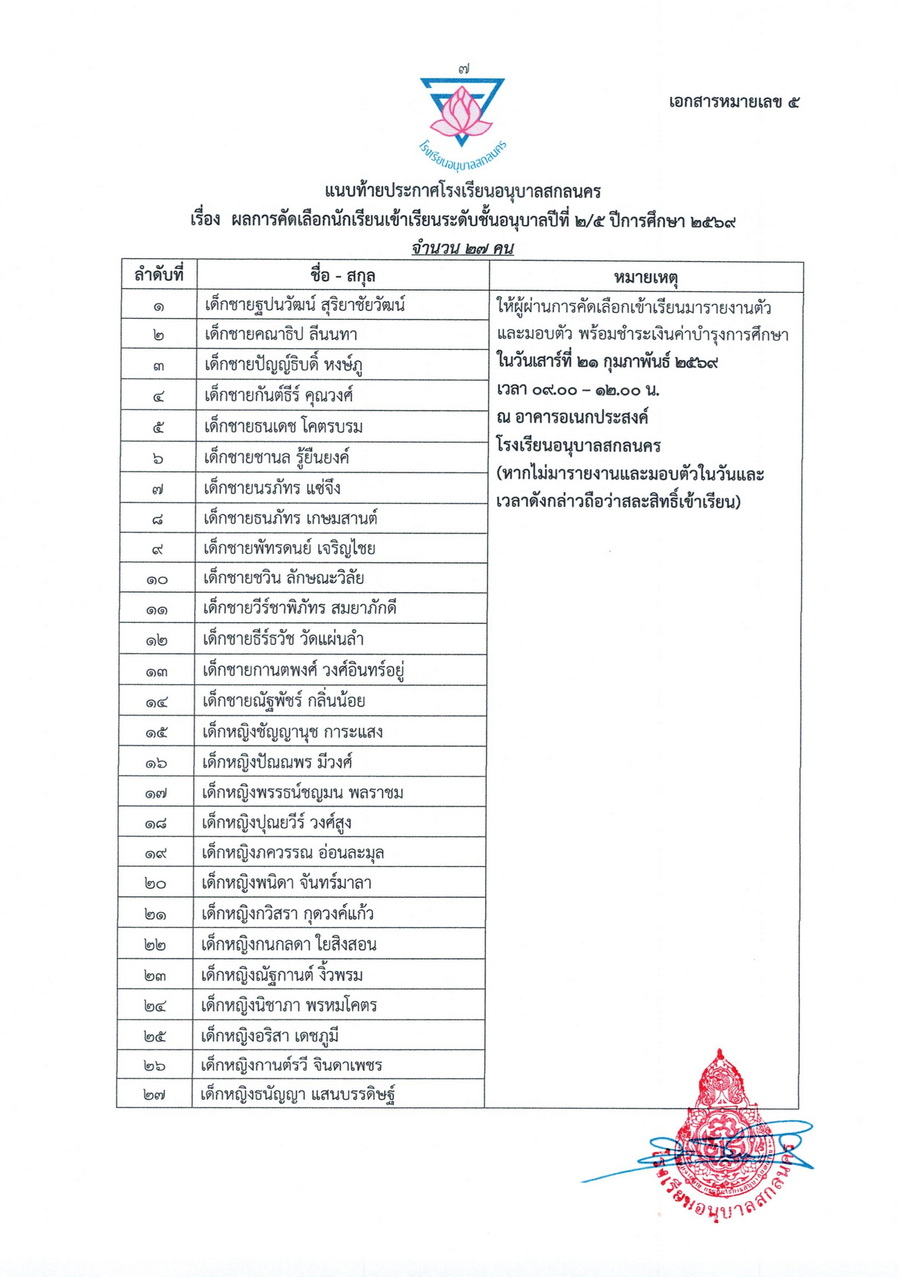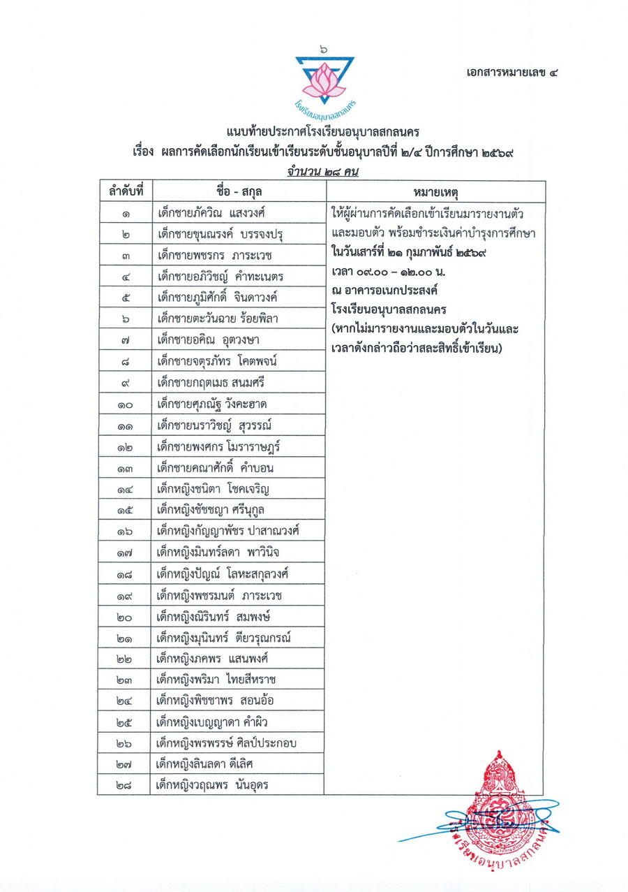 ประกาศผลการคัดเลือกนักเรียนชั้นอนุบาลปีที่ 2 ในปีการศึกษา 2569