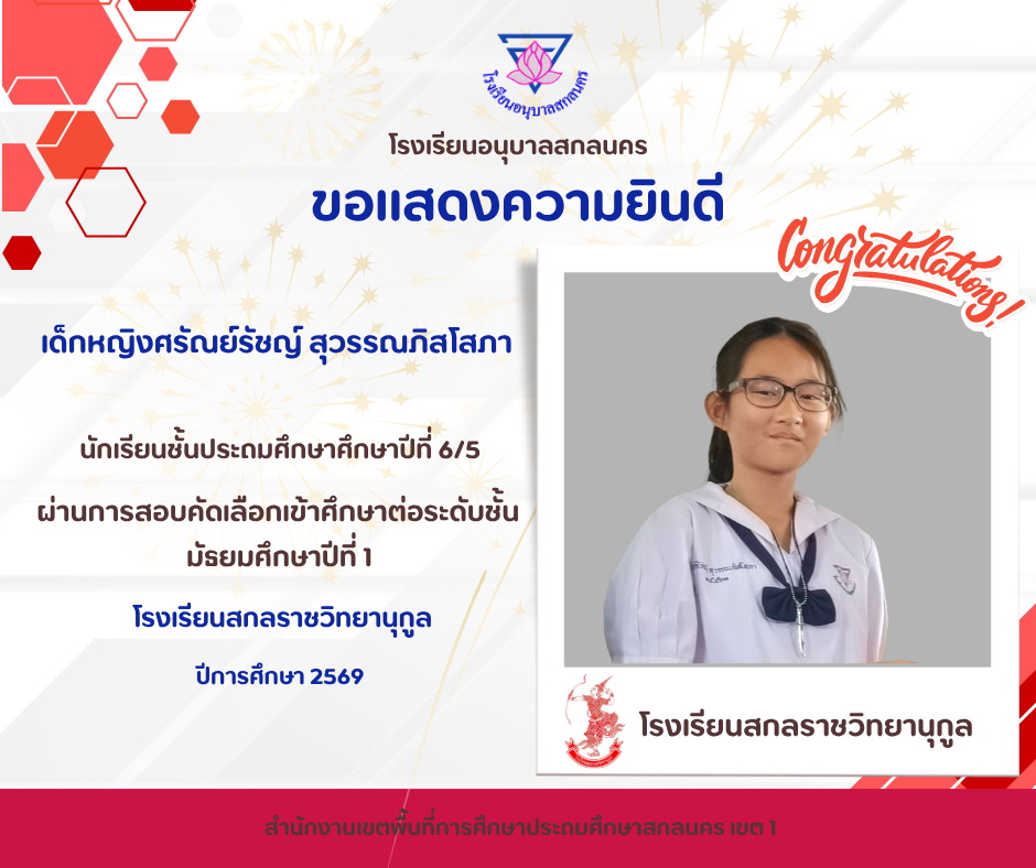 โรงเรียนอนุบาลสกลนคร ขอแสดงความยินดีกับนักเรียนที่ผ่านการสอบคัดเลือกเข้าศึกษาต่อ ชั้นมัธยมศึกษาปีที่ 1 โรงเรียนสกลราชวิทยานุกูล ในปีการศึกษา 2569