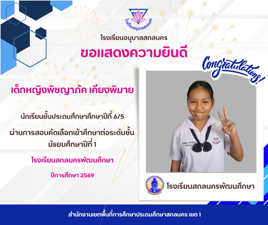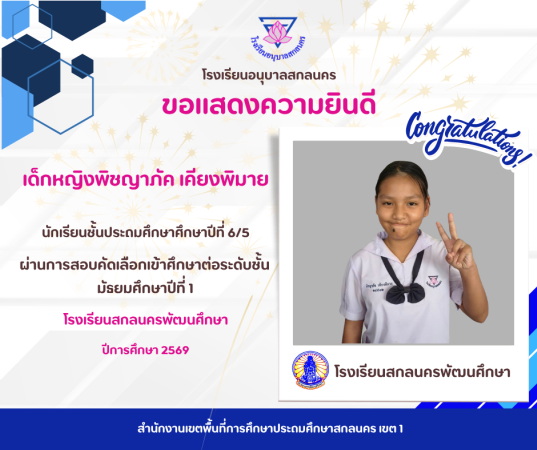 โรงเรียนอนุบาลสกลนคร ขอแสดงความยินดีกับนักเรียนที่ผ่านการสอบคัดเลือกเข้าศึกษาต่อ ชั้นมัธยมศึกษาปีที่ 1 โรงเรียนสกลนครพัฒนศึกษา ในปีการศึกษา 2569