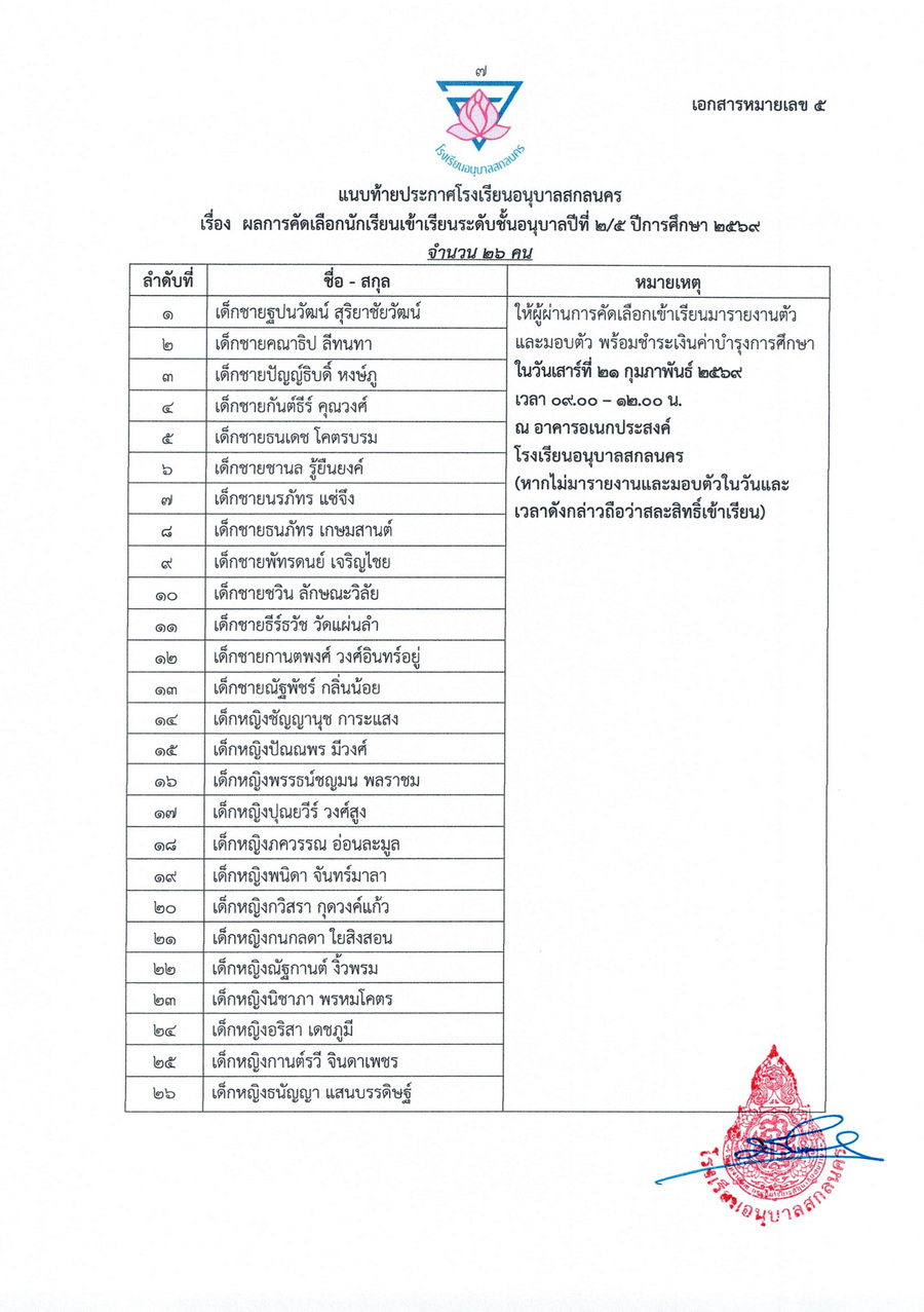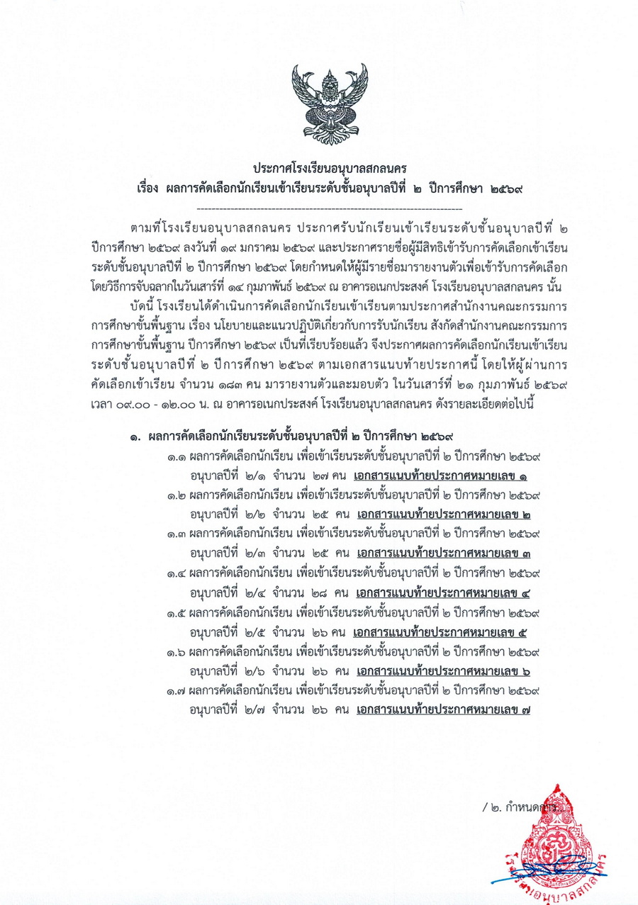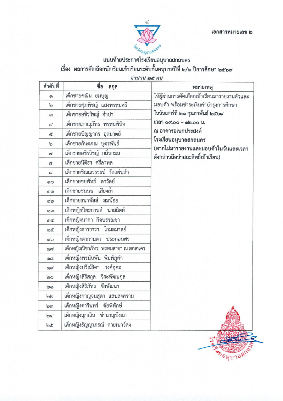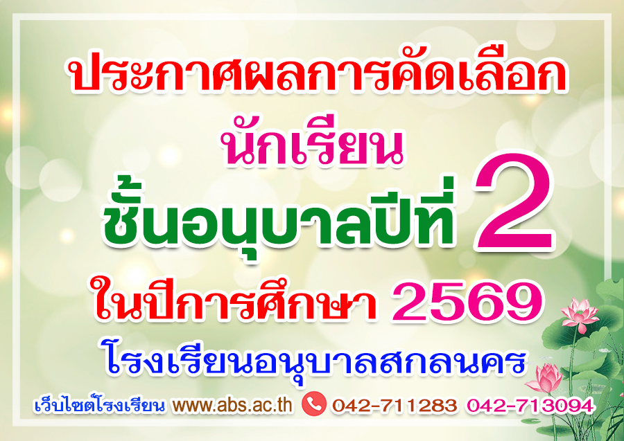 ประกาศผลการคัดเลือกนักเรียนชั้นอนุบาลปีที่ 2 ในปีการศึกษา 2569