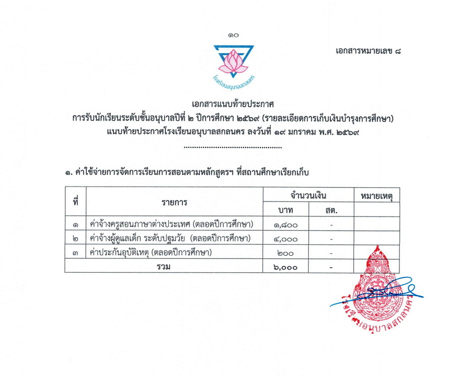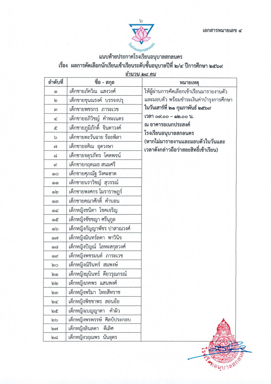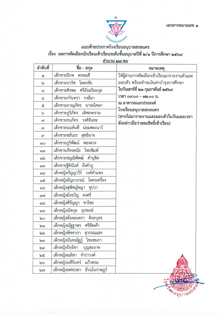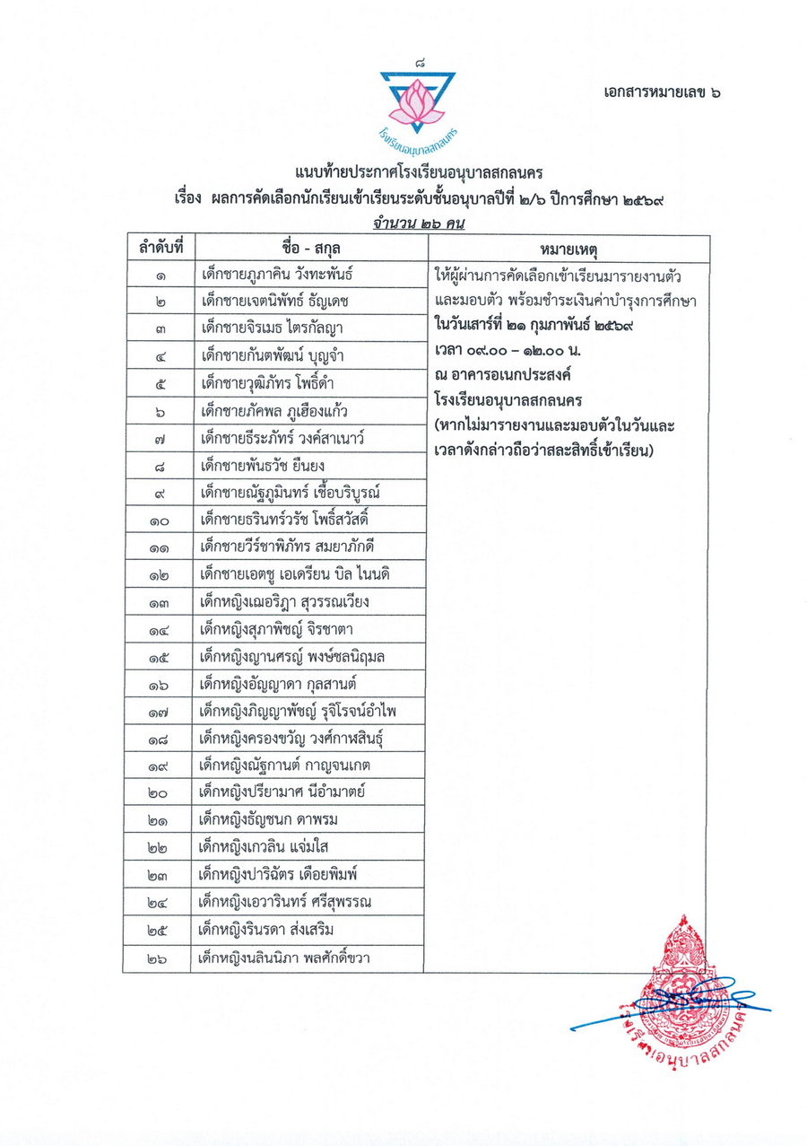 ประกาศผลการคัดเลือกนักเรียนชั้นอนุบาลปีที่ 2 ในปีการศึกษา 2569