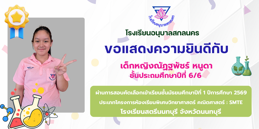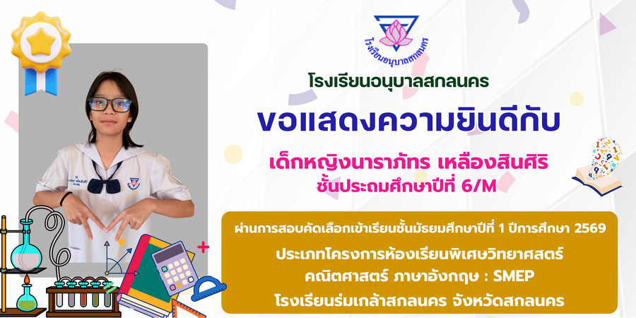 ขอแสดงความยินดี กับนักเรียนที่ผ่านการสอบคัดเลือกเข้าเรียนชั้นมัธยมศึกษาปีที่ 1 ประเภทห้องเรียนพิเศษวิทยาศาสตร์ คณิตศาสตร์ โรงเรียนร่มเกล้าสกลนคร และโรงเรียนสตรีนนทบุรี ปีการศึกษา 2569