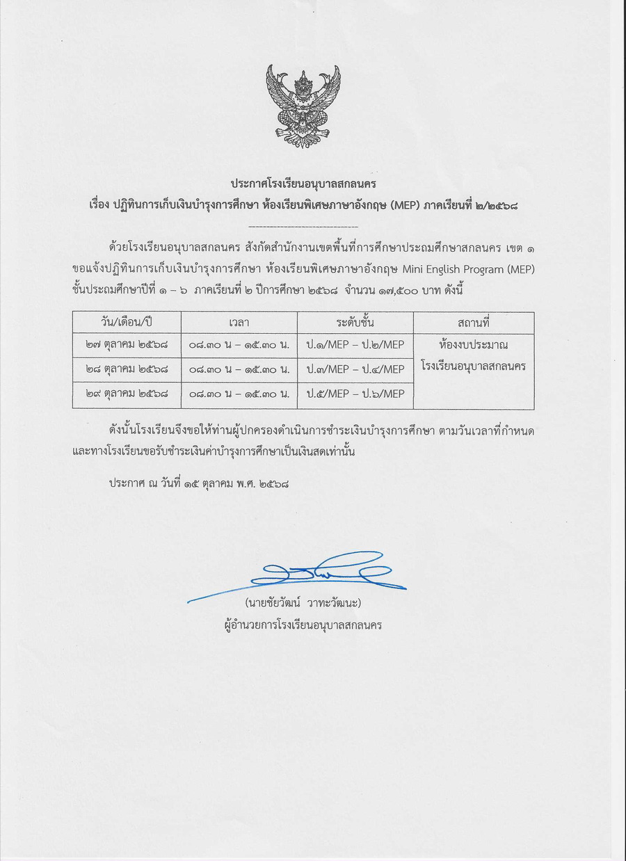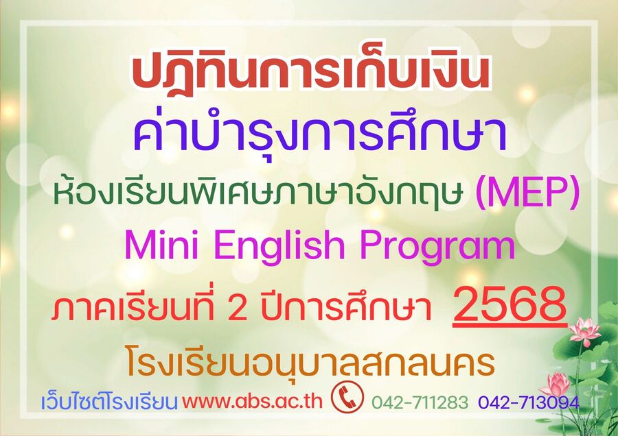 ปฏิทินกำหนดการเก็บเงินบำรุงการศึกษา ห้องเรียนพิเศษภาษาอังกฤษ (MEP) ภาคเรียนที่ 2 ปีการศึกษา 2568