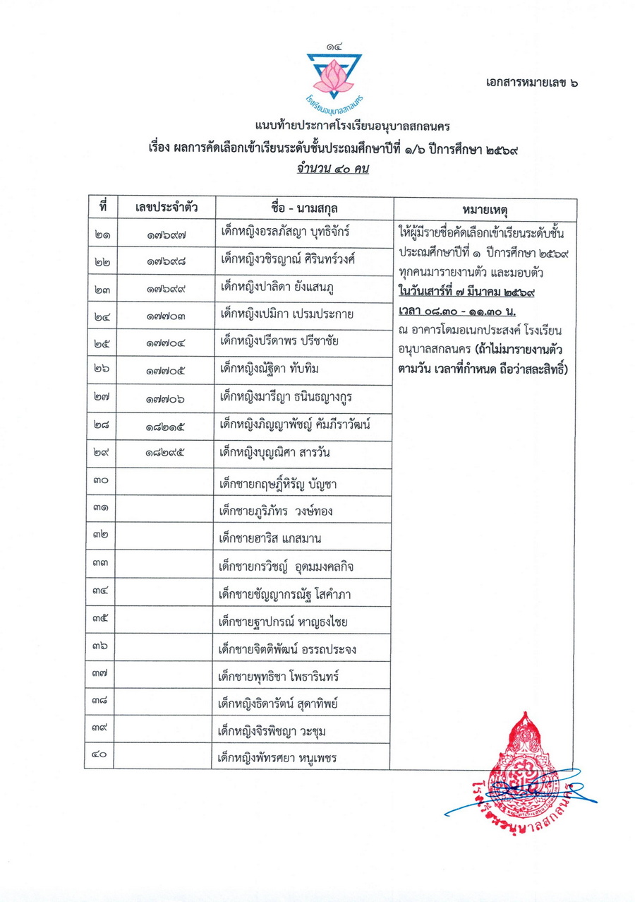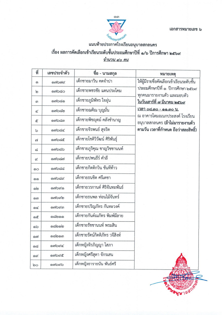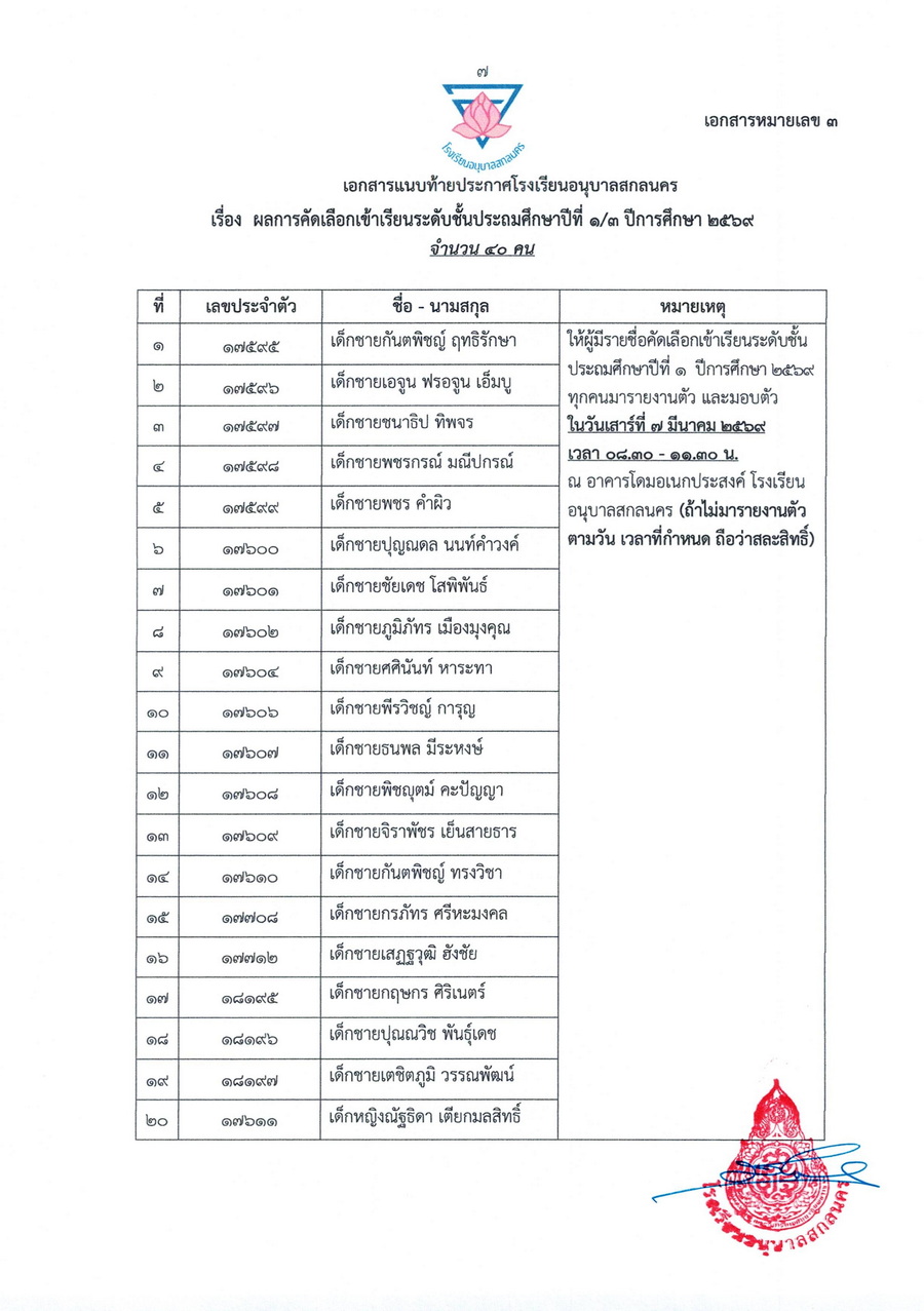 ประกาศผลการคัดเลือกนักเรียนชั้นประถมศึกษาปีที่ 1 (ห้องเรียนทั่วไป) ปีการศึกษา 2569