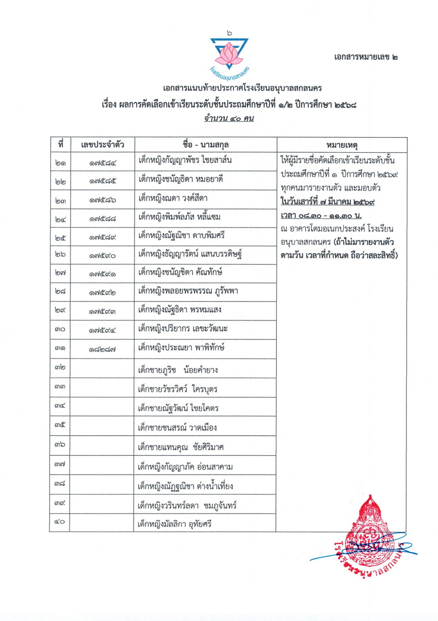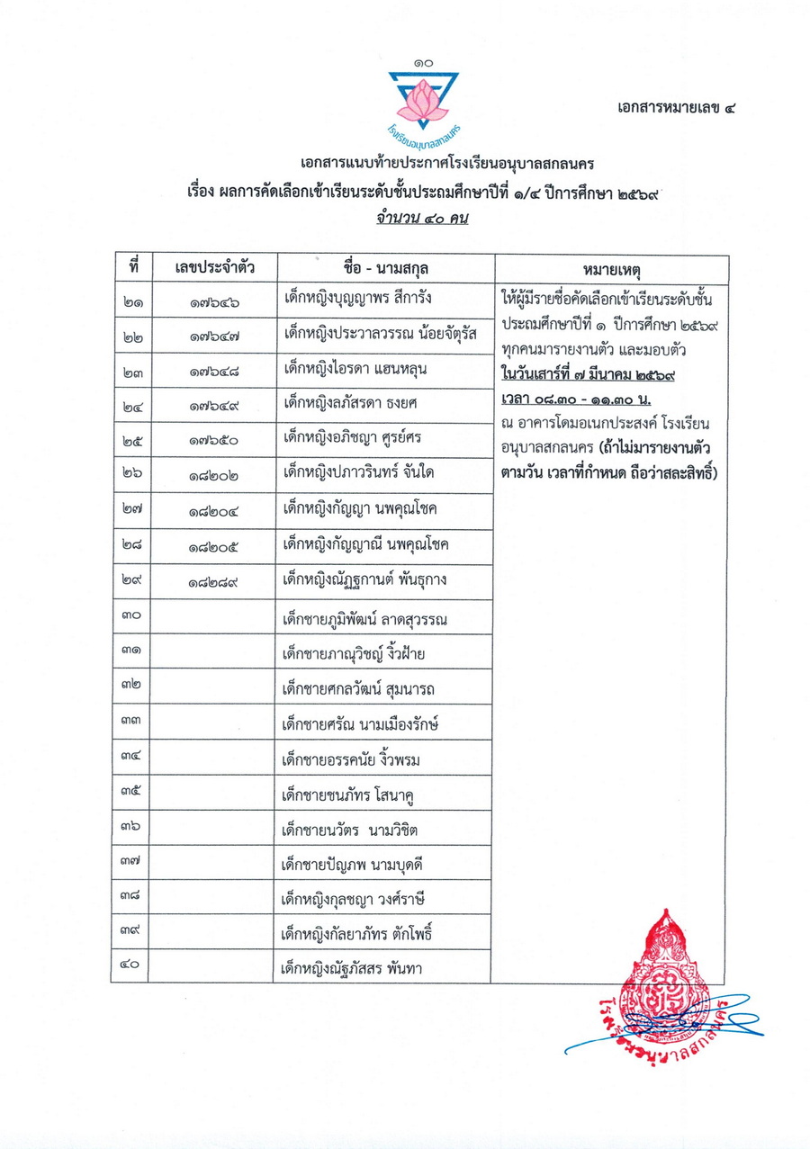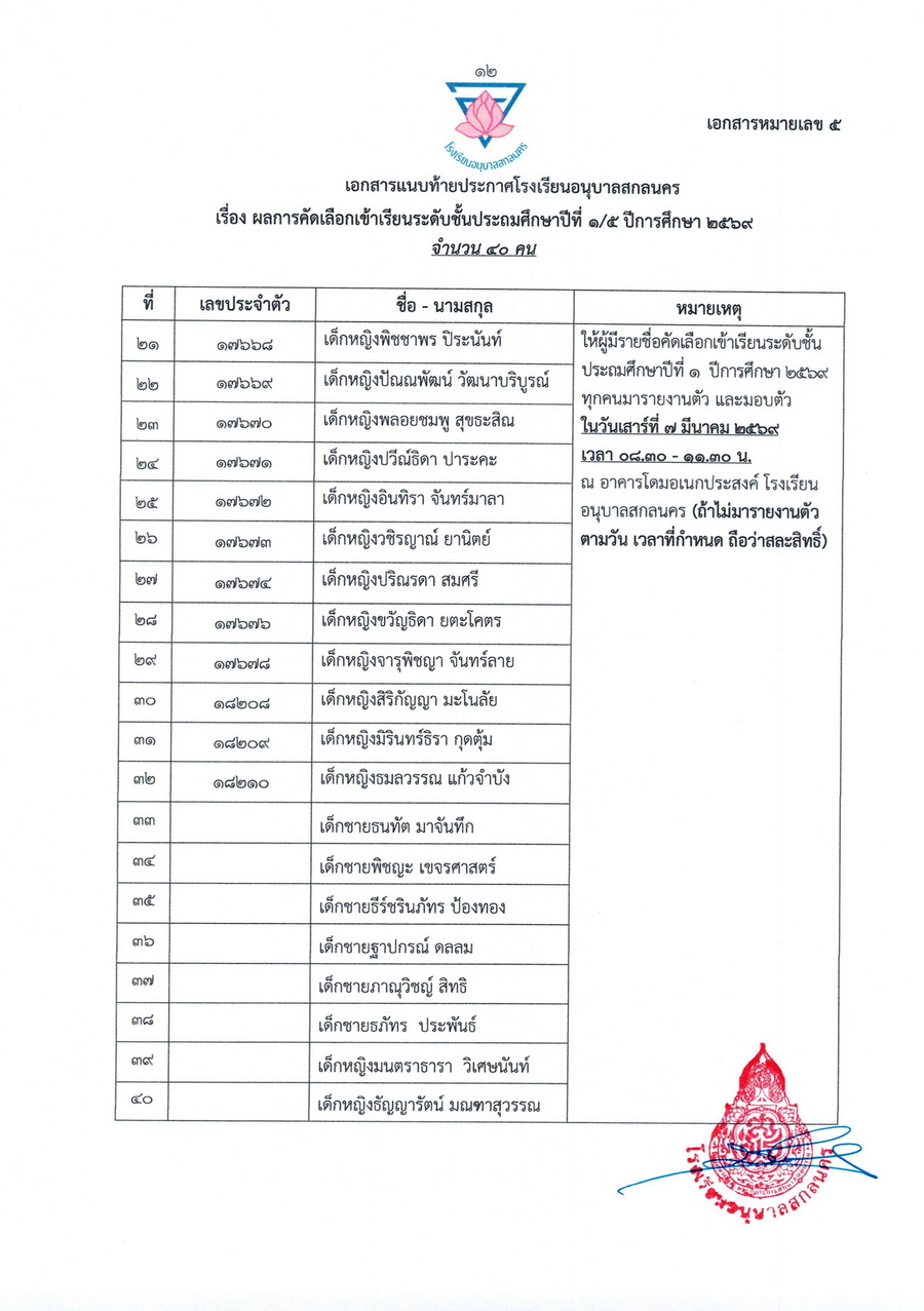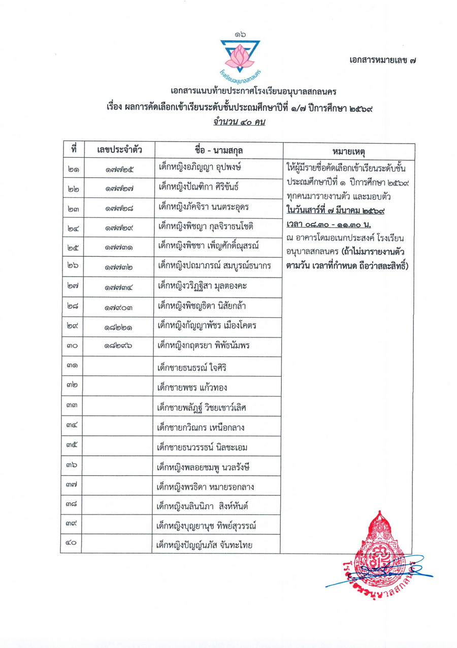 ประกาศผลการคัดเลือกนักเรียนชั้นประถมศึกษาปีที่ 1 (ห้องเรียนทั่วไป) ปีการศึกษา 2569
