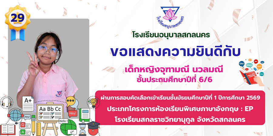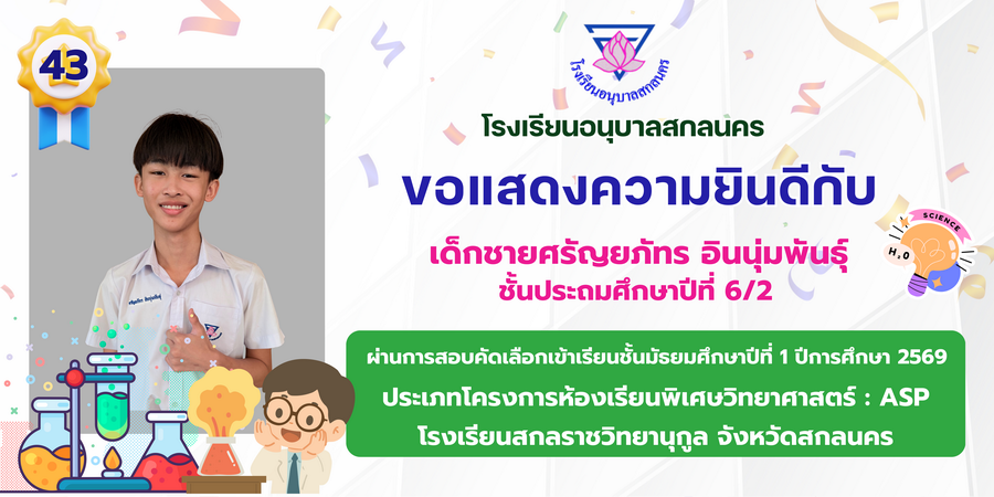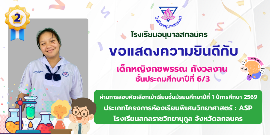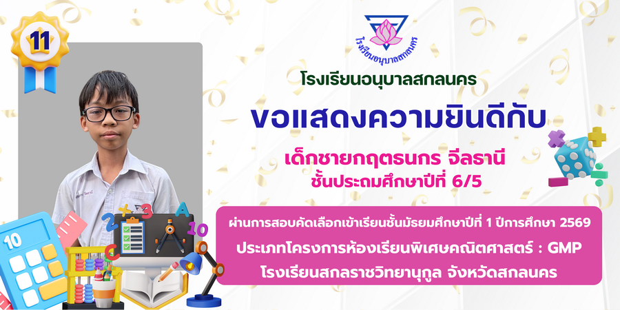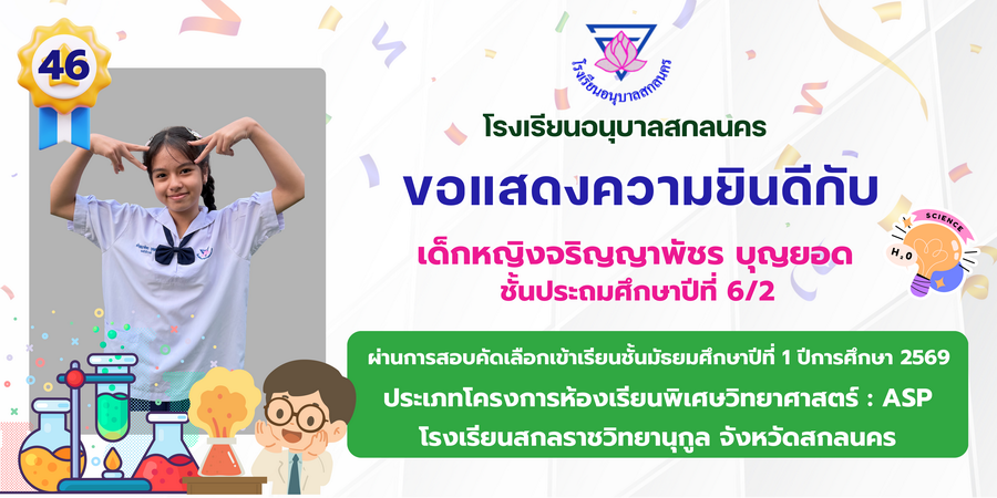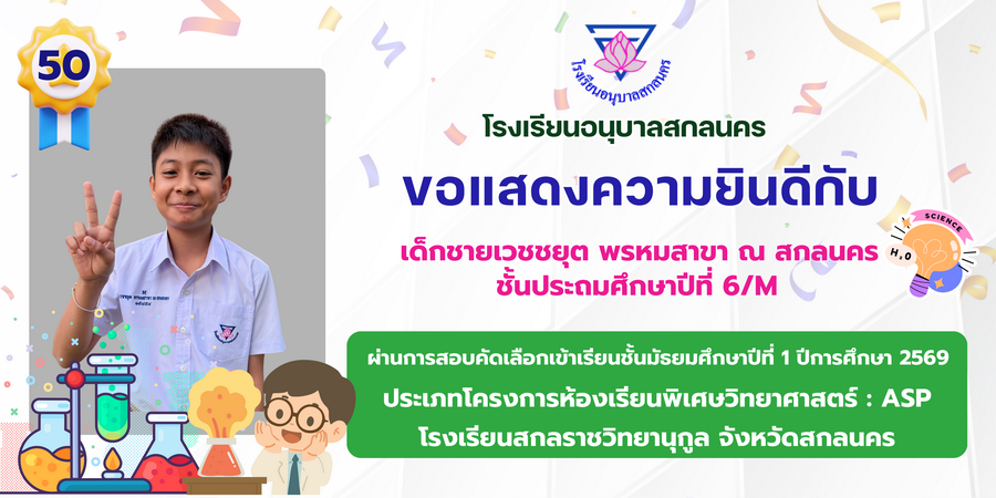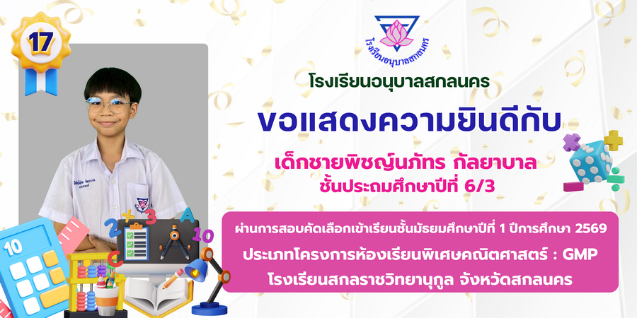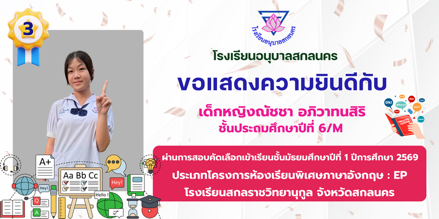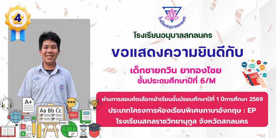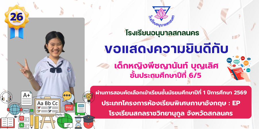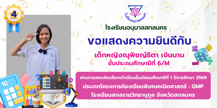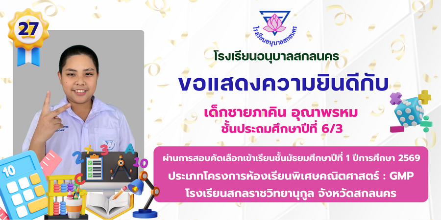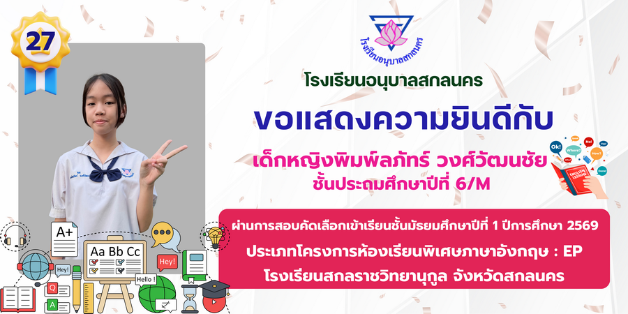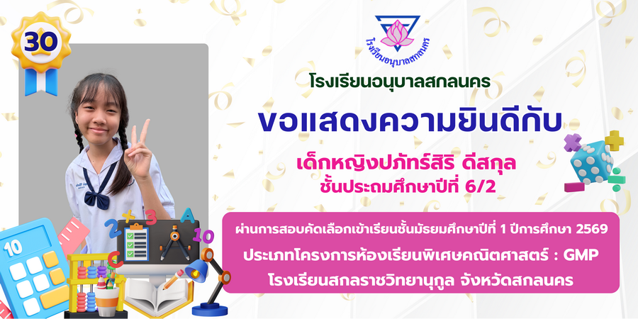 ขอแสดงความยินดี กับนักเรียนที่ผ่านการสอบคัดเลือกเข้าเรียนชั้นมัธยมศึกษาปีที่ 1 ประเภทห้องเรียนพิเศษ ASP / GMP / EP / CS โรงเรียนสกลราชวิทยานุกูล ปีการศึกษา 2569