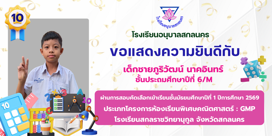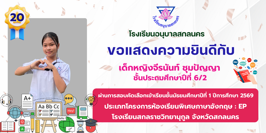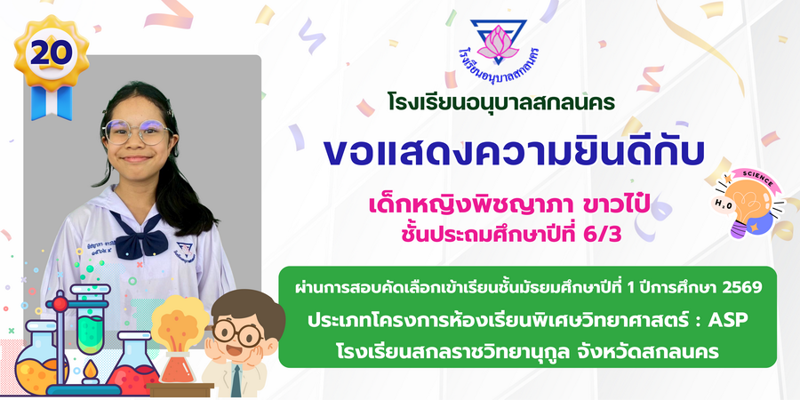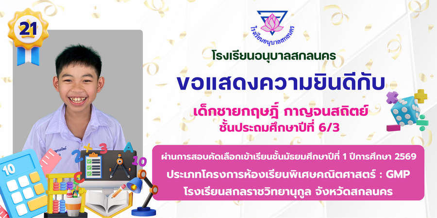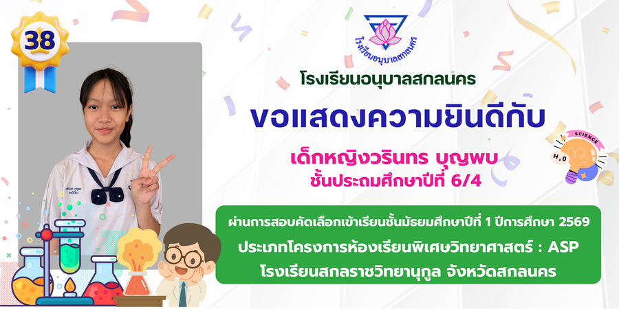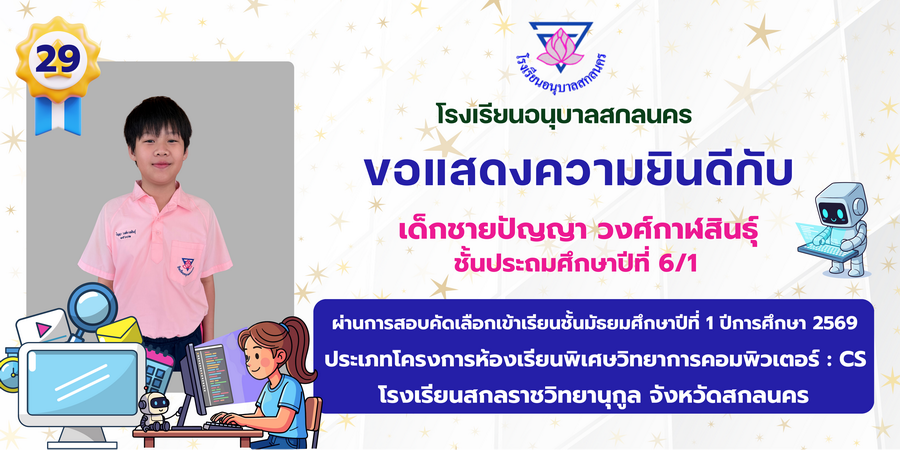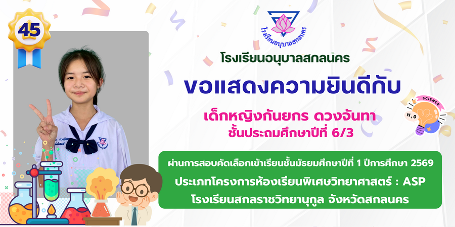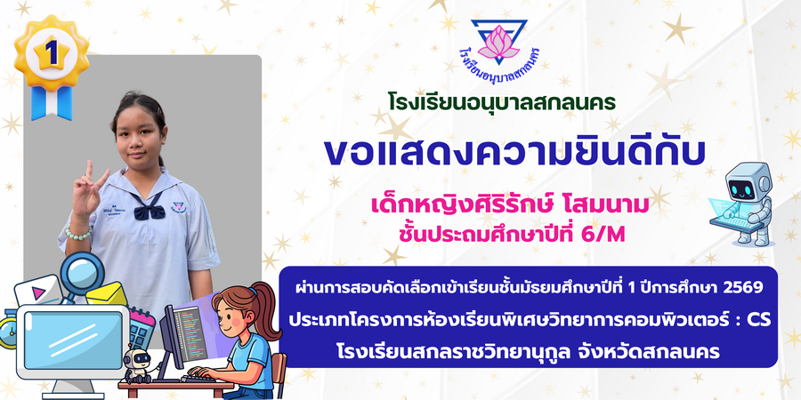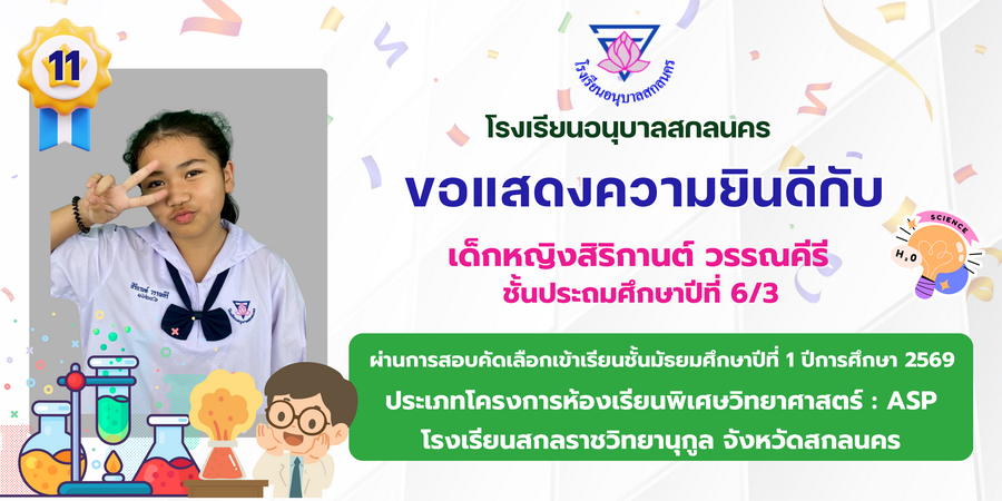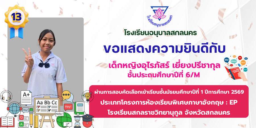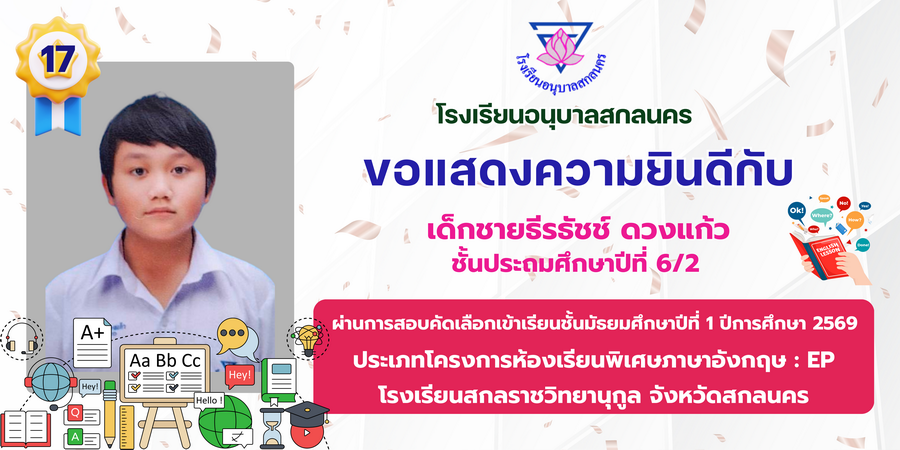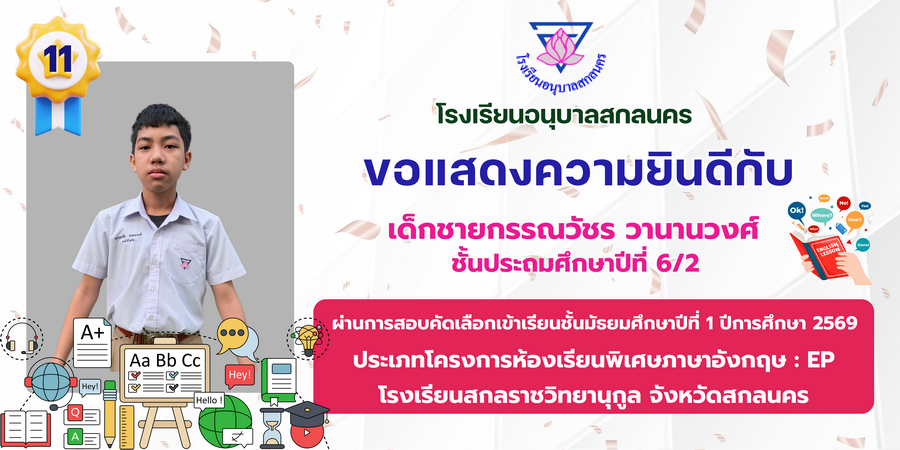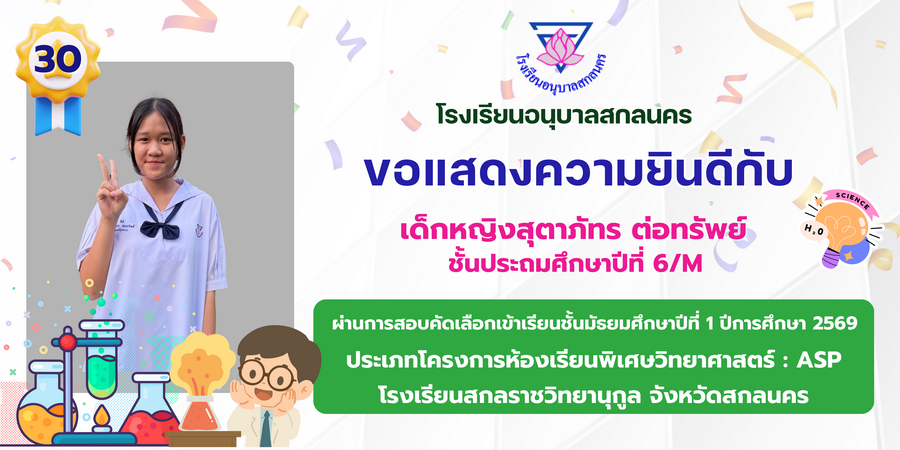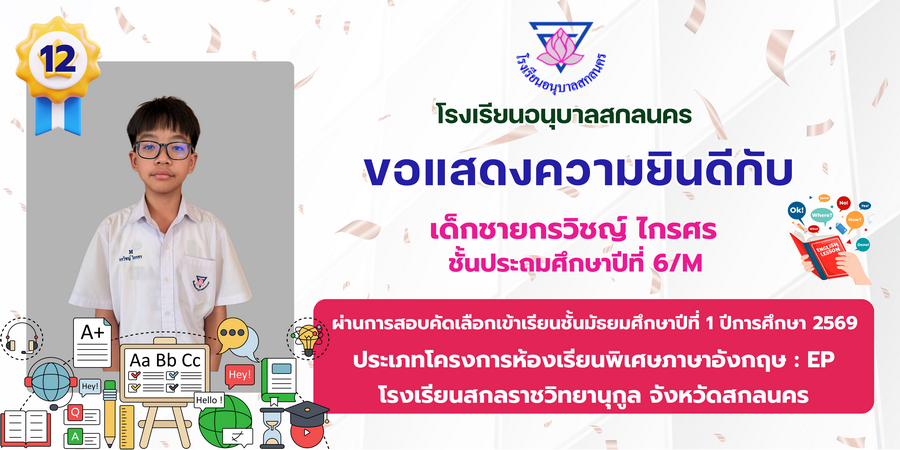 ขอแสดงความยินดี กับนักเรียนที่ผ่านการสอบคัดเลือกเข้าเรียนชั้นมัธยมศึกษาปีที่ 1 ประเภทห้องเรียนพิเศษ ASP / GMP / EP / CS โรงเรียนสกลราชวิทยานุกูล ปีการศึกษา 2569