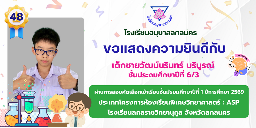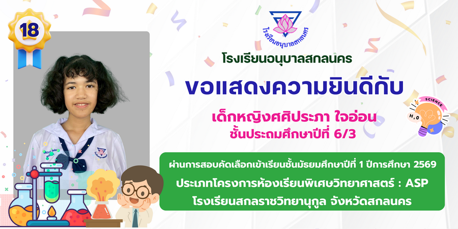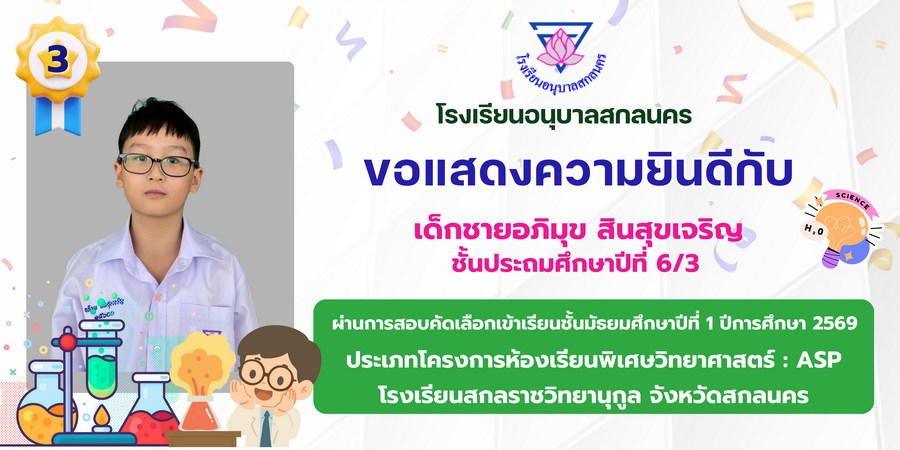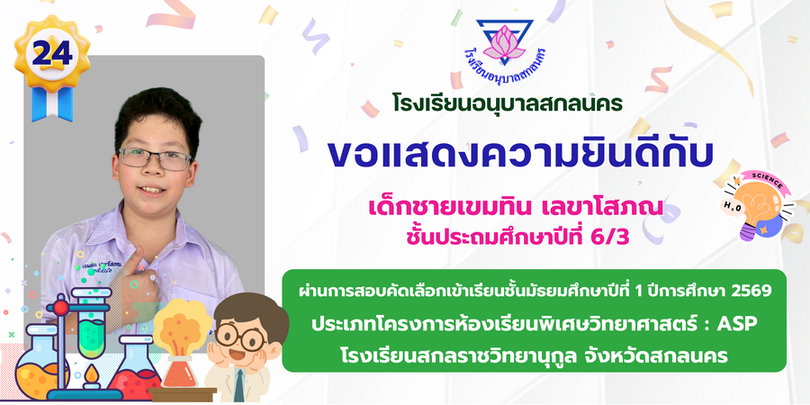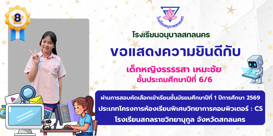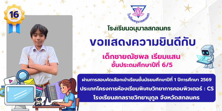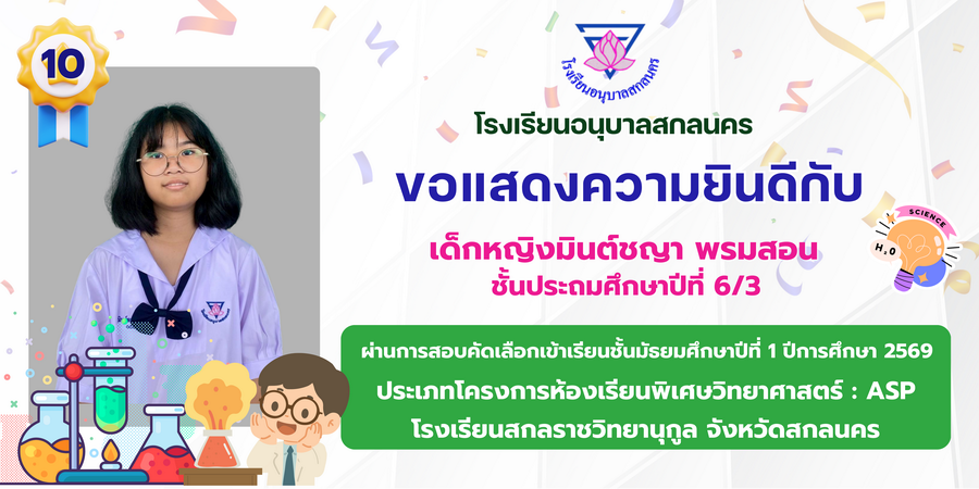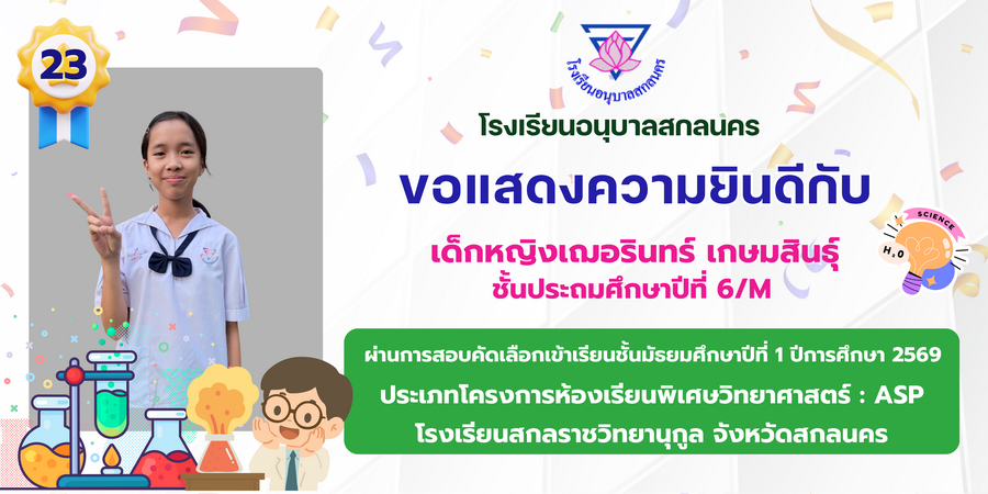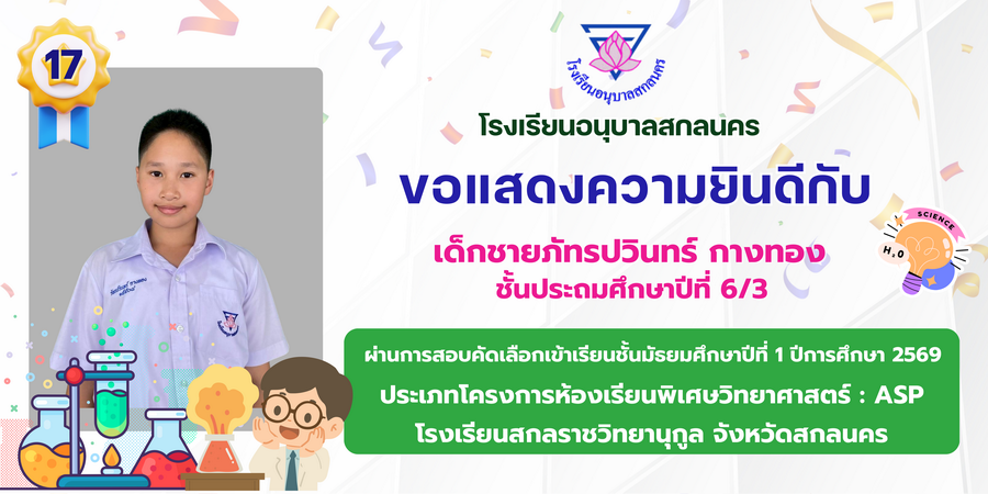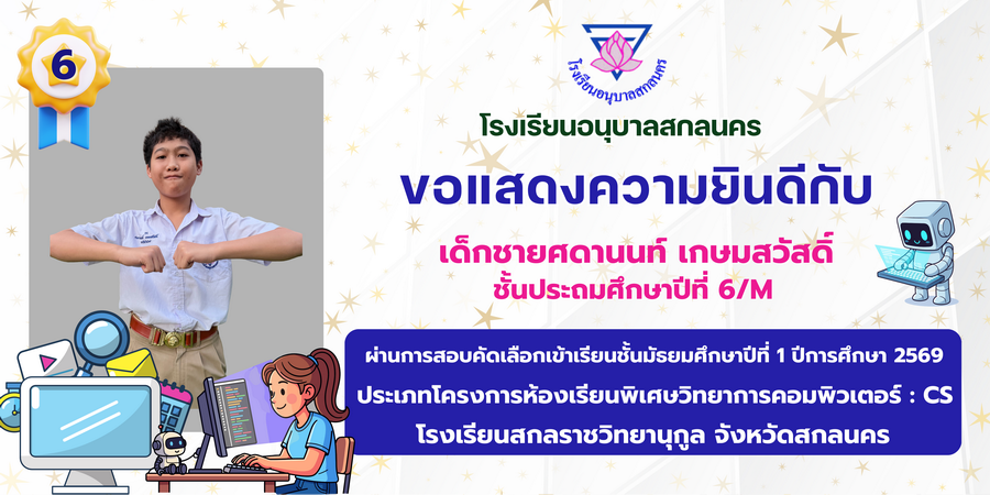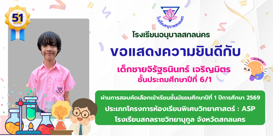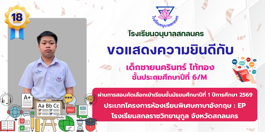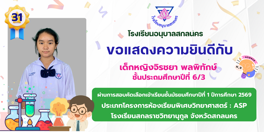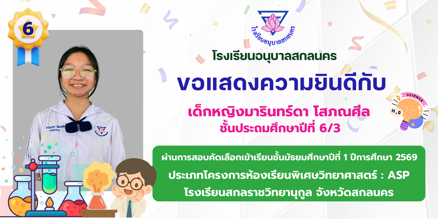 ขอแสดงความยินดี กับนักเรียนที่ผ่านการสอบคัดเลือกเข้าเรียนชั้นมัธยมศึกษาปีที่ 1 ประเภทห้องเรียนพิเศษ ASP / GMP / EP / CS โรงเรียนสกลราชวิทยานุกูล ปีการศึกษา 2569