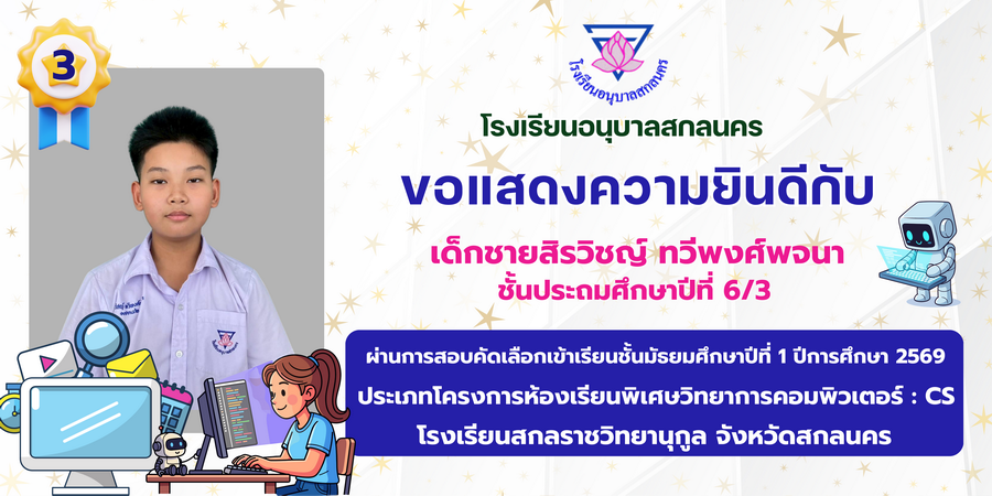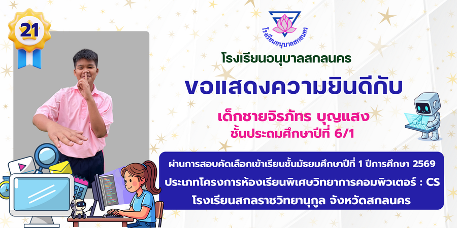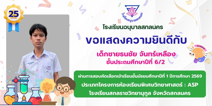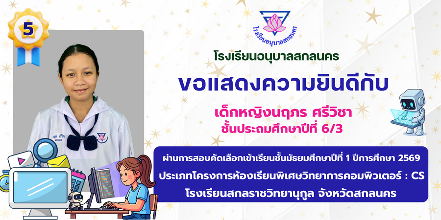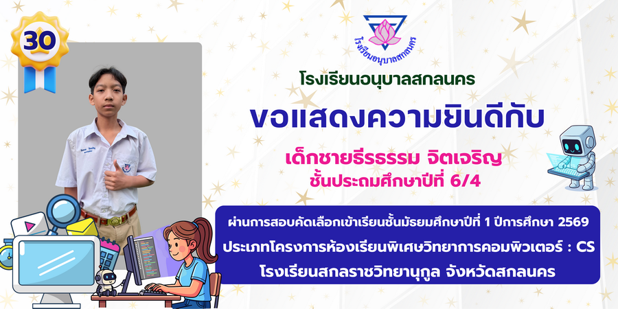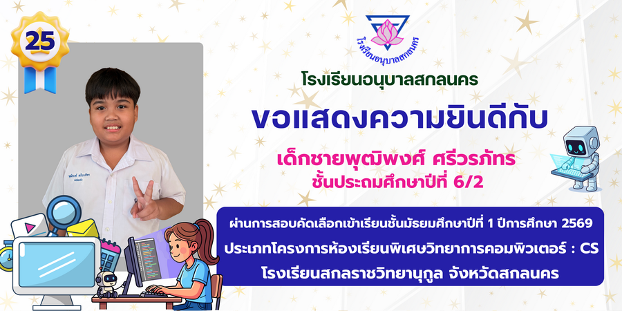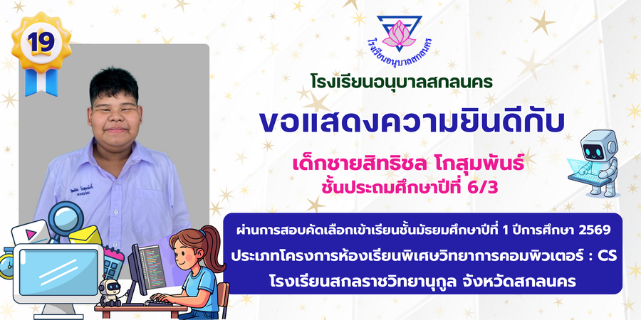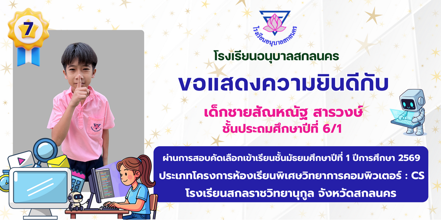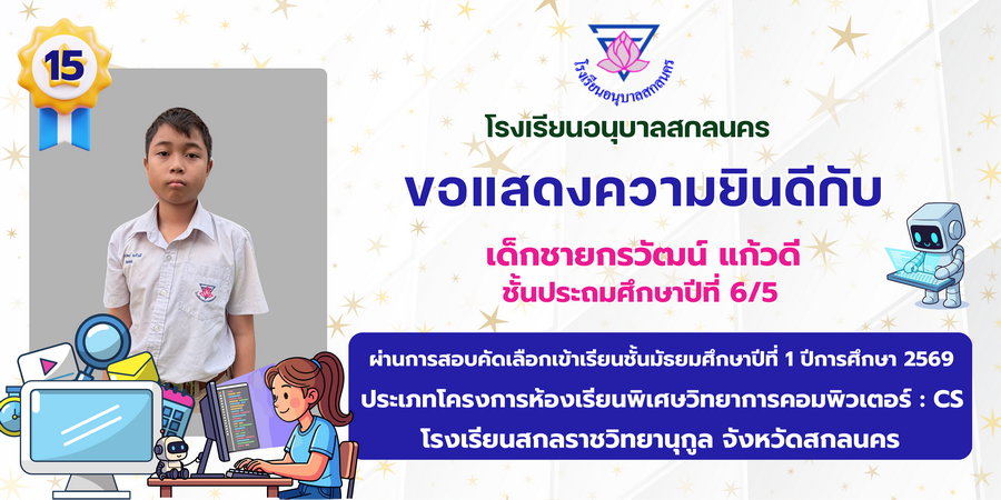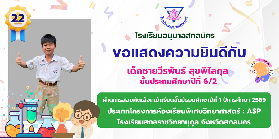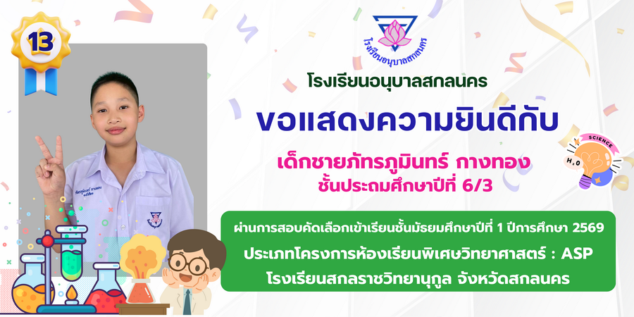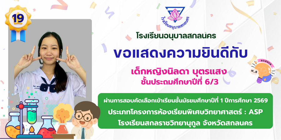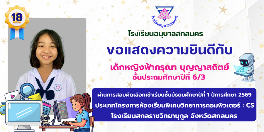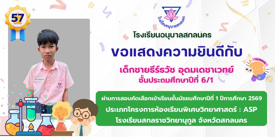ขอแสดงความยินดี กับนักเรียนที่ผ่านการสอบคัดเลือกเข้าเรียนชั้นมัธยมศึกษาปีที่ 1 ประเภทห้องเรียนพิเศษ ASP / GMP / EP / CS โรงเรียนสกลราชวิทยานุกูล ปีการศึกษา 2569