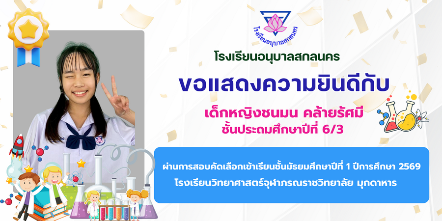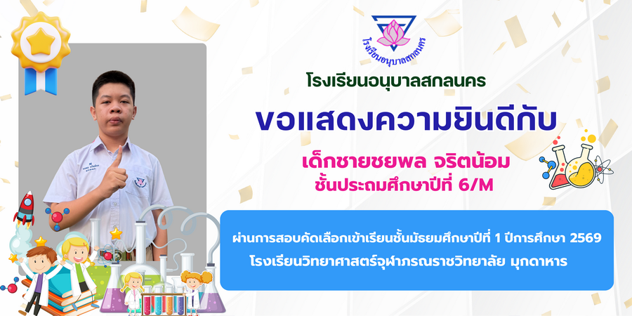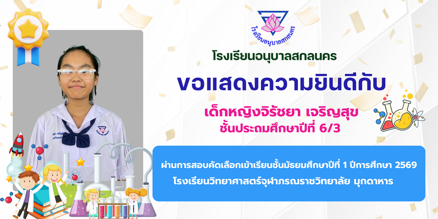 ขอแสดงความยินดี กับนักเรียนที่ผ่านการสอบคัดเลือกเข้าเรียนชั้นมัธยมศึกษาปีที่ 1 โรงเรียนวิทยาศาสตร์จุฬาภรณราชวิทยาลัย มุกดาหาร ปีการศึกษา 2569