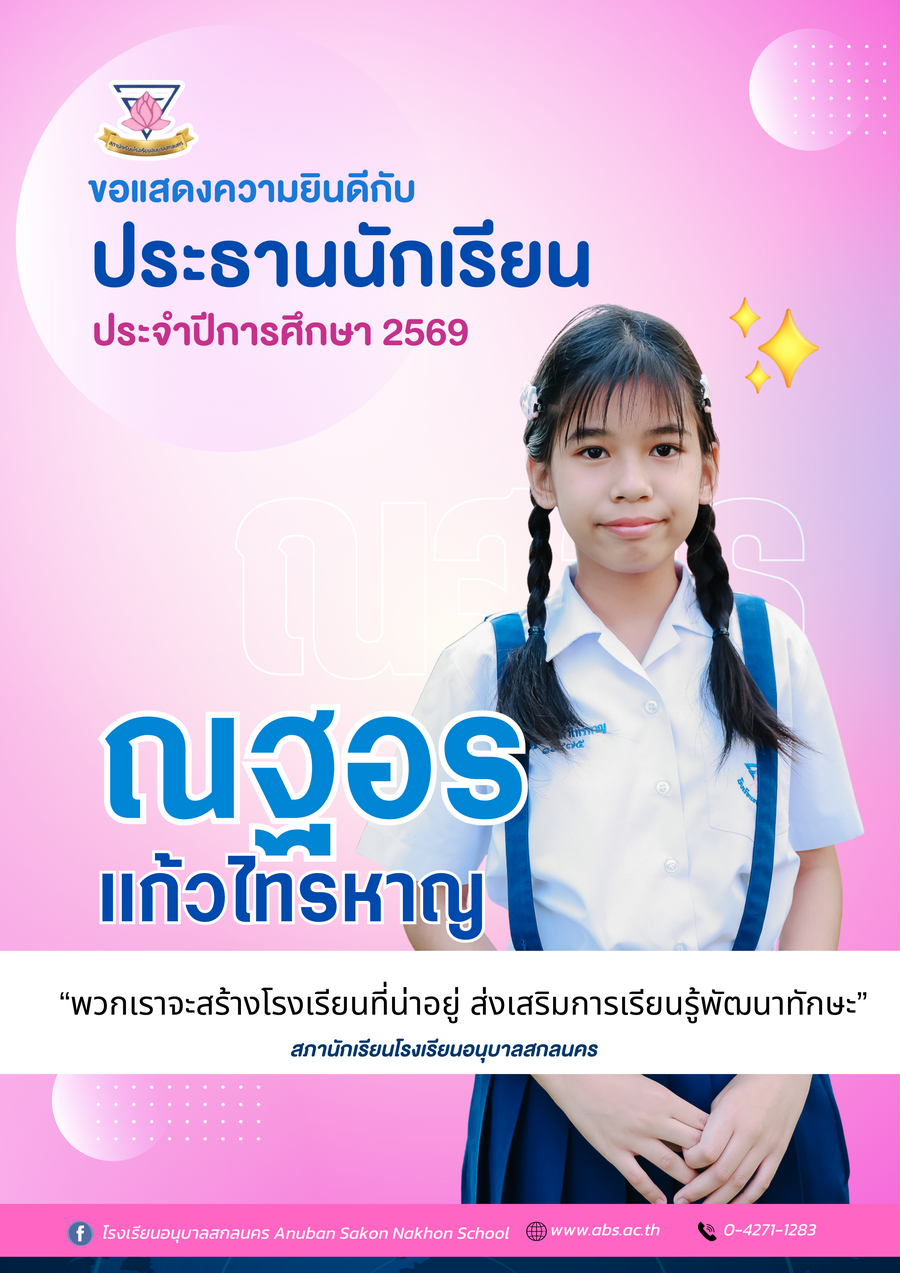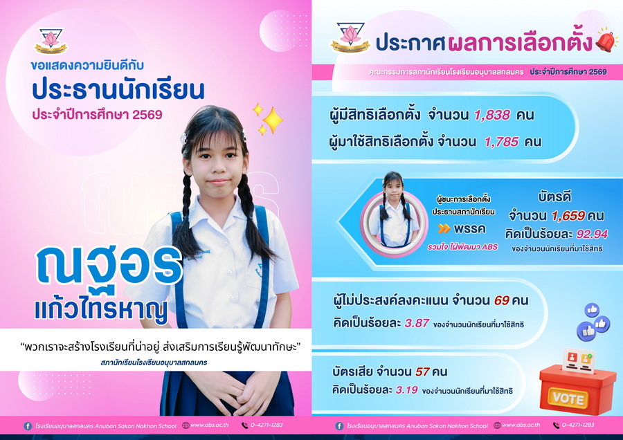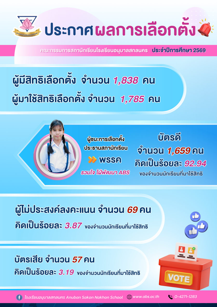ผลการเลือกตั้งคณะกรรมการสภานักเรียน ปีการศึกษา 2569 ขอแสดงความยินดีกับ เด็กหญิงณฐอร แก้วไทรหาญ ตำแหน่งประธานสภานักเรียนโรงเรียนอนุบาลสกลนคร