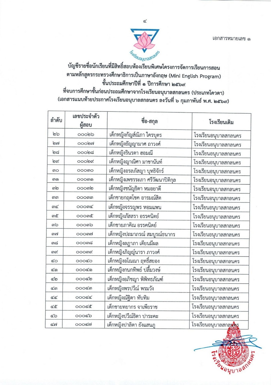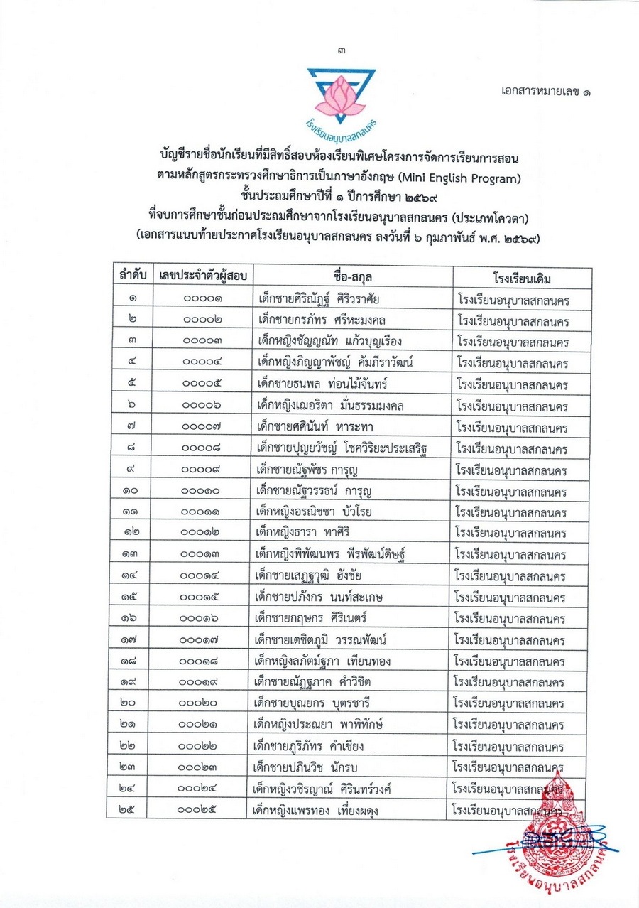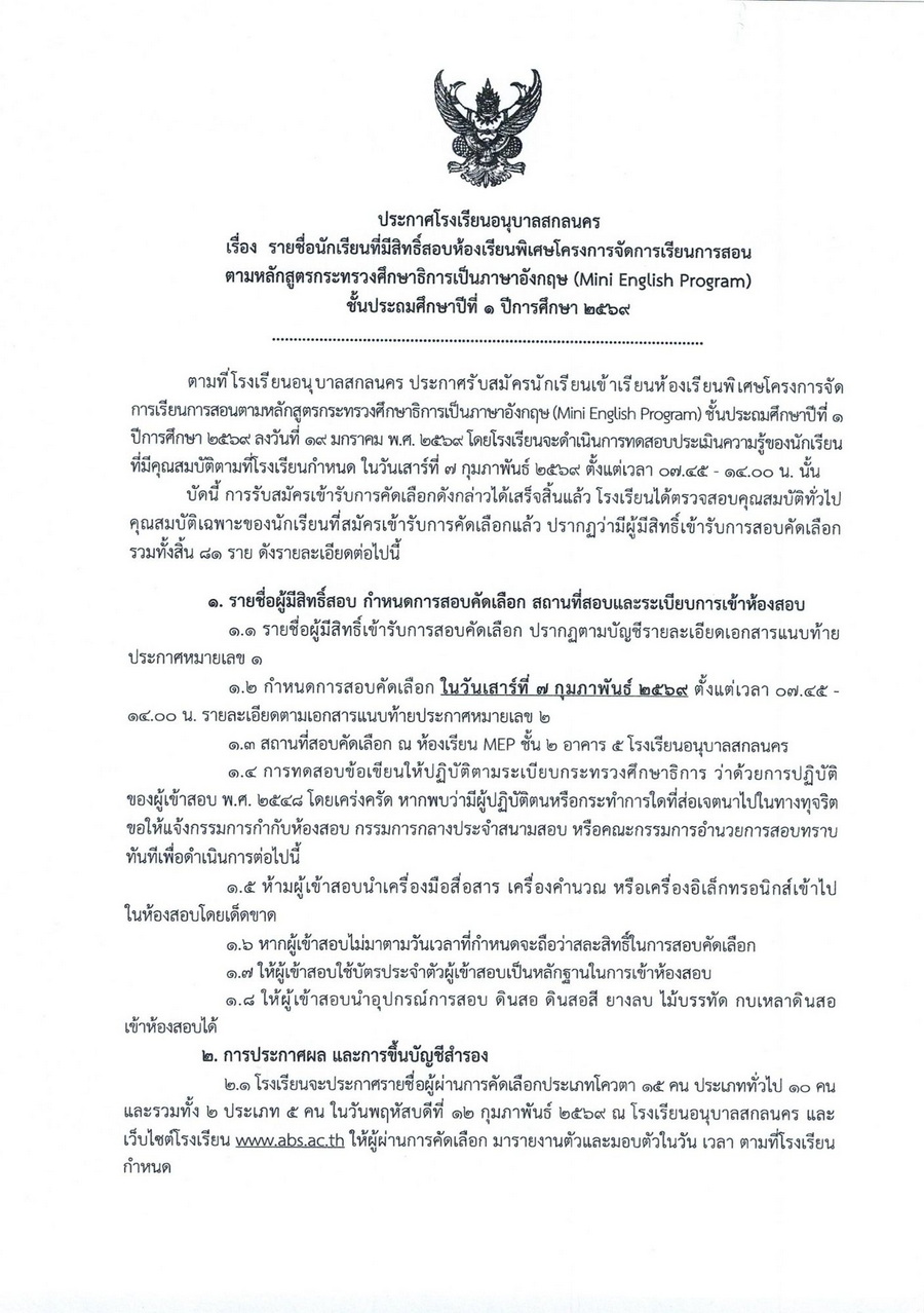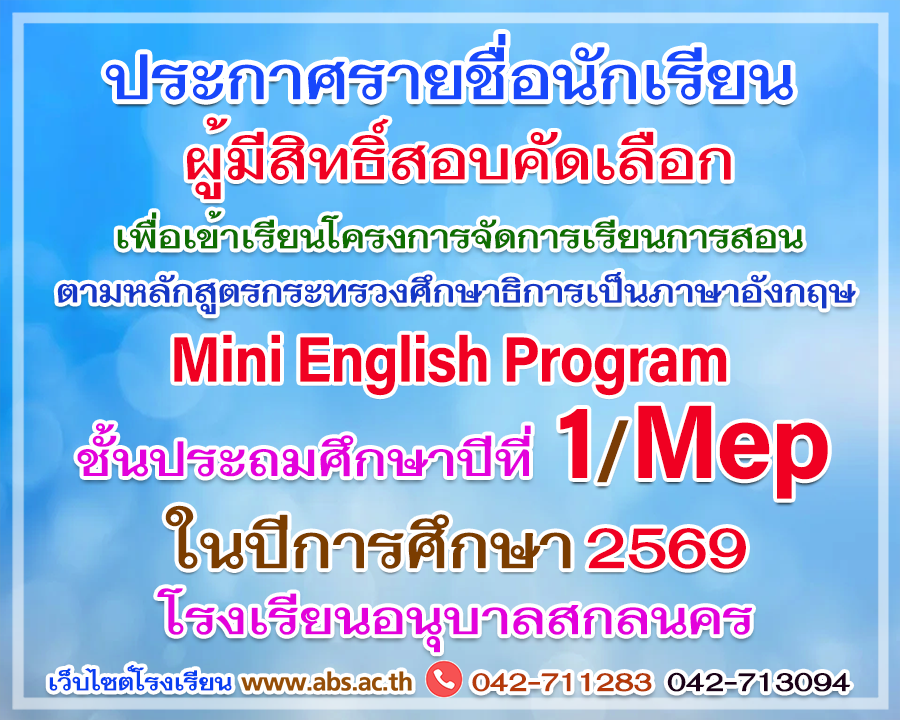 ประกาศรายชื่อผู้มีสิทธิ์คัดเลือกเข้าเรียนห้องเรียนพิเศษ Mini English Program (MEP) ชั้นประถมศึกษาปีที่ 1 ปีการศึกษา 2569
