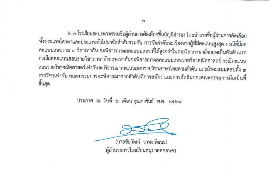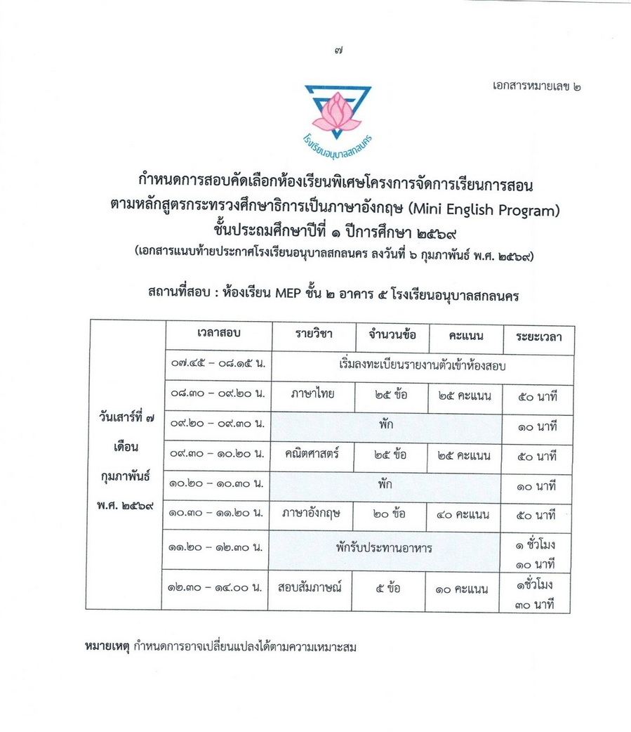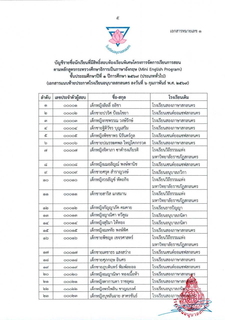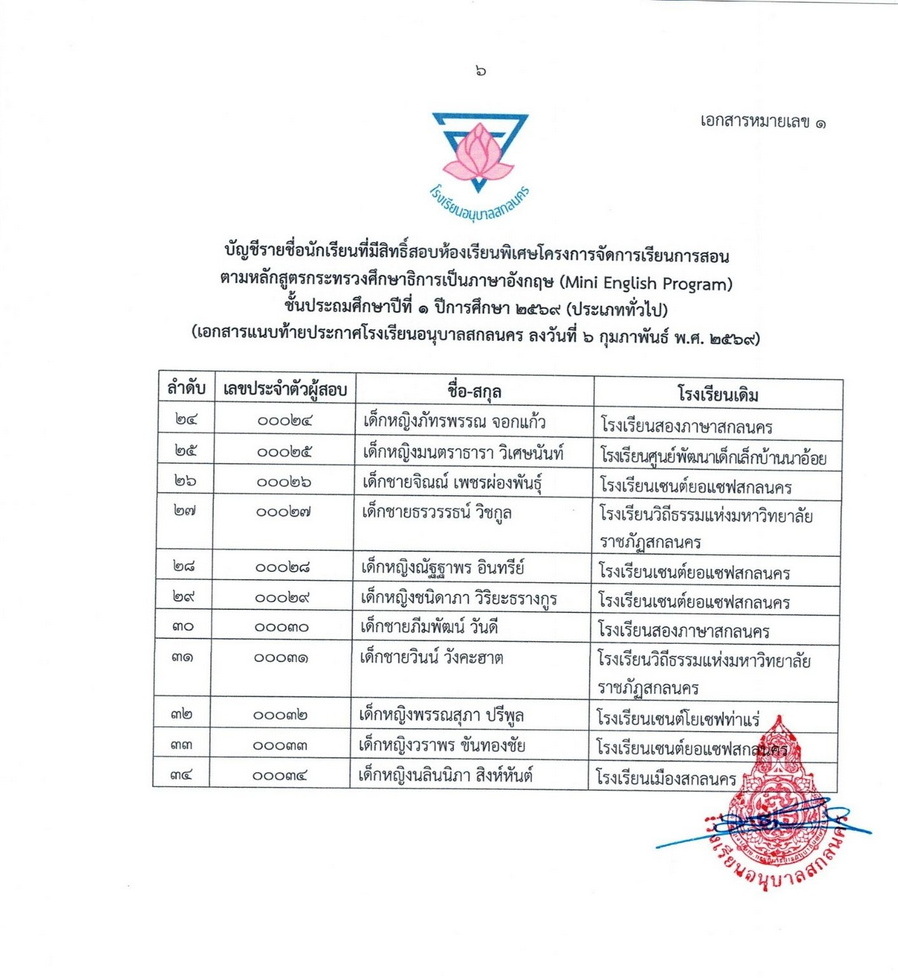 ประกาศรายชื่อผู้มีสิทธิ์คัดเลือกเข้าเรียนห้องเรียนพิเศษ Mini English Program (MEP) ชั้นประถมศึกษาปีที่ 1 ปีการศึกษา 2569