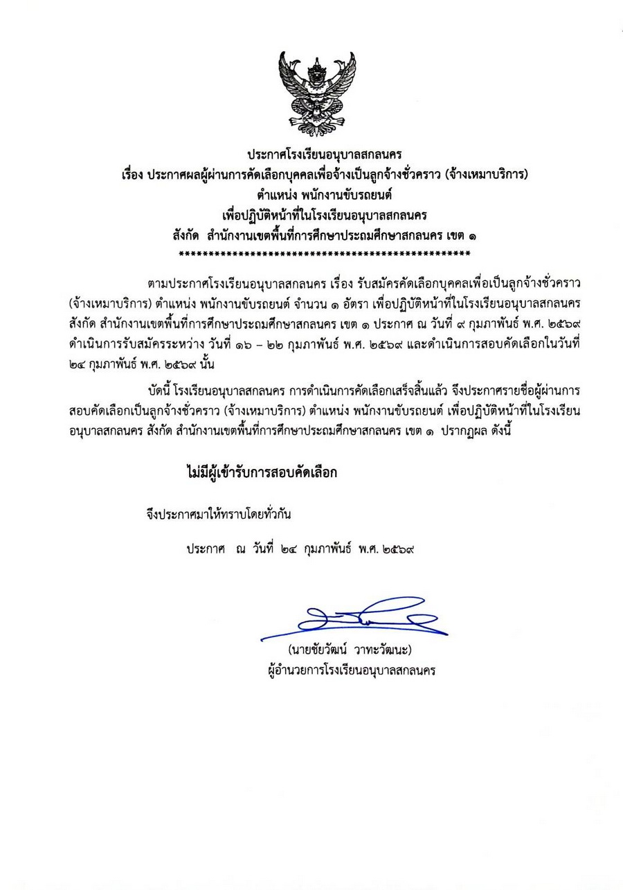 ประกาศผลการคัดเลือกบุคคลเพื่อเป็นลูกจ้างชั่วคราว ตำแหน่งพนักงานขับรถยนต์