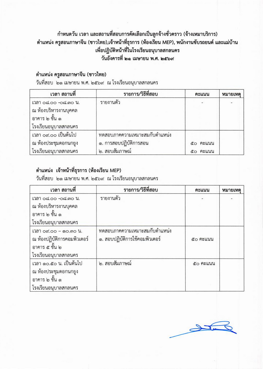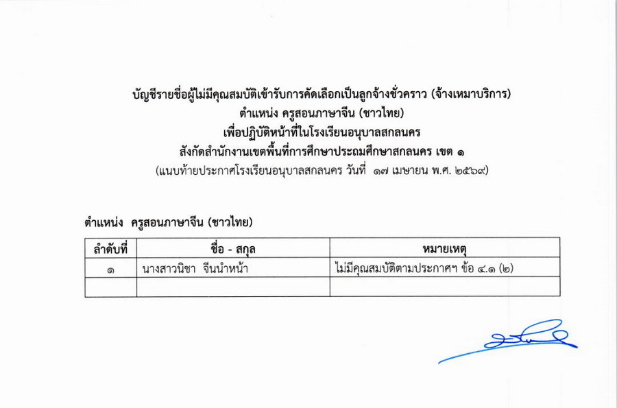 ประกาศรายชื่อผู้มีสิทธิ์รับการคัดเลือกเป็นลูกจ้างชั่วคราว ในโรงเรียนอนุบาลสกลนคร