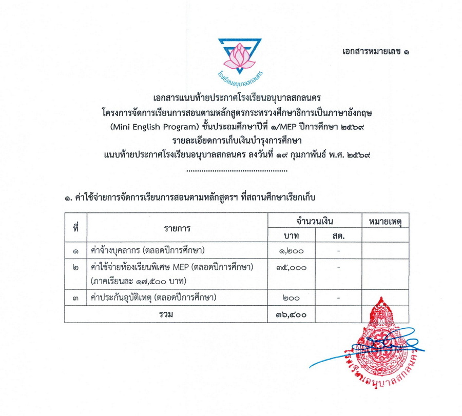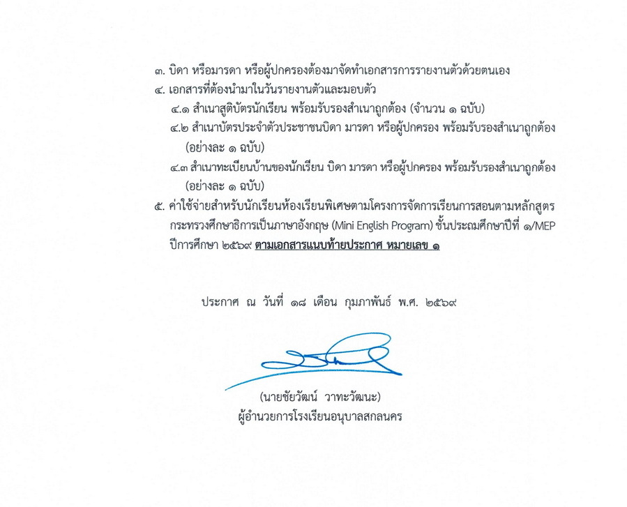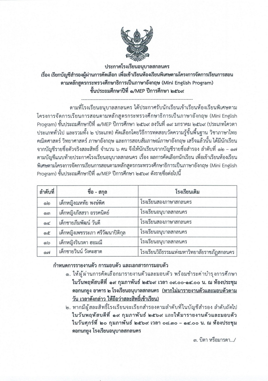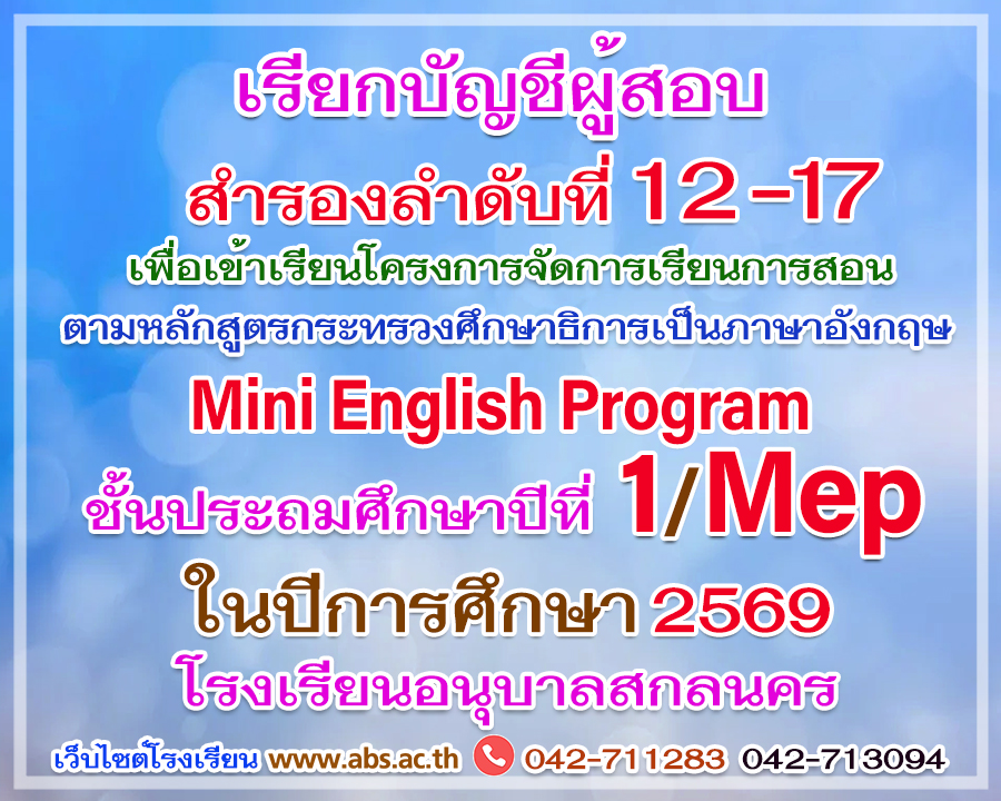 เรียกผู้สอบได้สำรอง ลำดับที่ 12 - 17 รายงานตัวเพื่อเข้าเรียนห้องเรียนพิเศษโครงการจัดการเรียนการสอนตามหลักสูตรกระทรวงศึกษาธิการเป็นภาษาอังกฤษ (Mini English Program) ชั้นประถมศึกษาปีที่ 1 ปีการศึกษา 2569