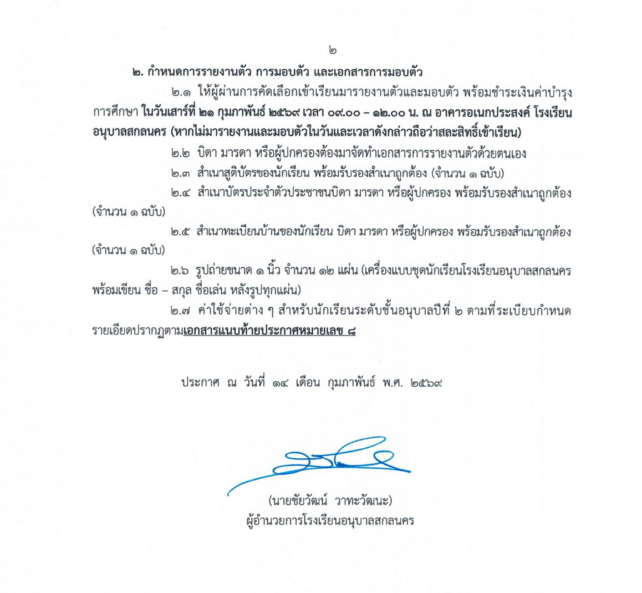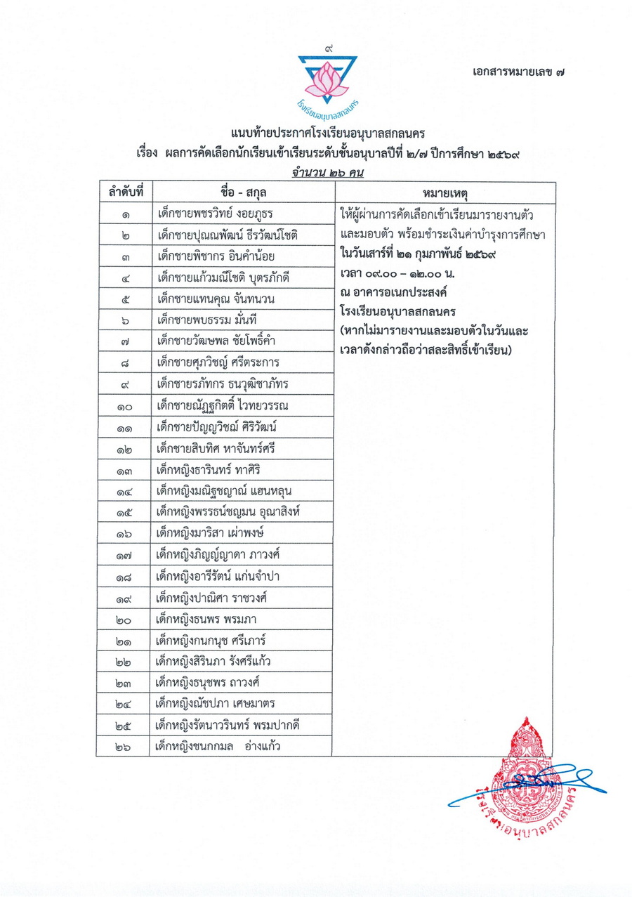 ประกาศผลการคัดเลือกนักเรียนชั้นอนุบาลปีที่ 2 ในปีการศึกษา 2569