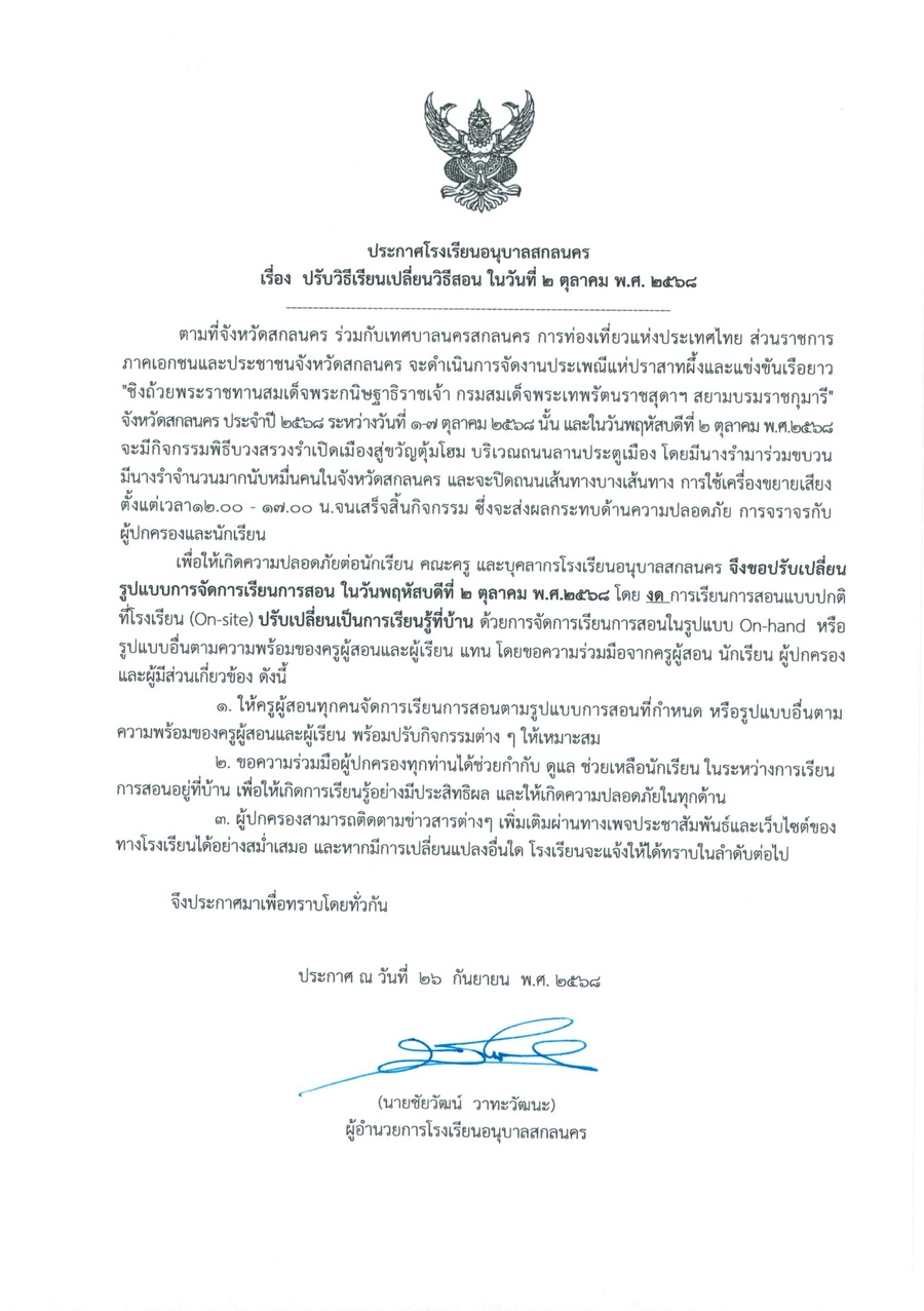 ประกาศโรงเรียนอนุบาลสกลนคร เรื่อง ปรับวิธีเรียนเปลี่ยนวิธีสอน ในวันพฤหัสบดีที่ 2 ตุลาคม 2568