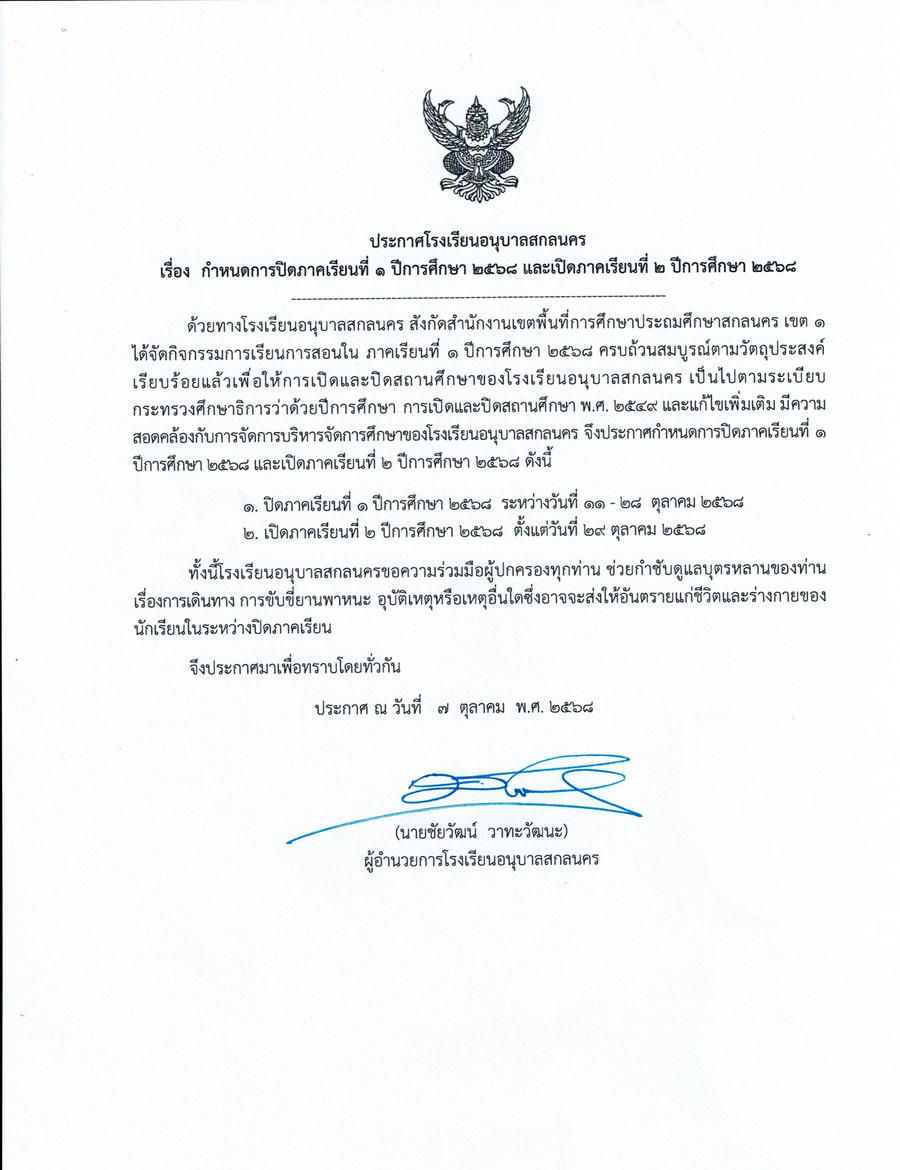 กำหนดการปิดภาคเรียนที่ 1 และเปิดภาคเรียนที่ 2 ปีการศึกษา 2568 โรงเรียนอนุบาลสกลนคร