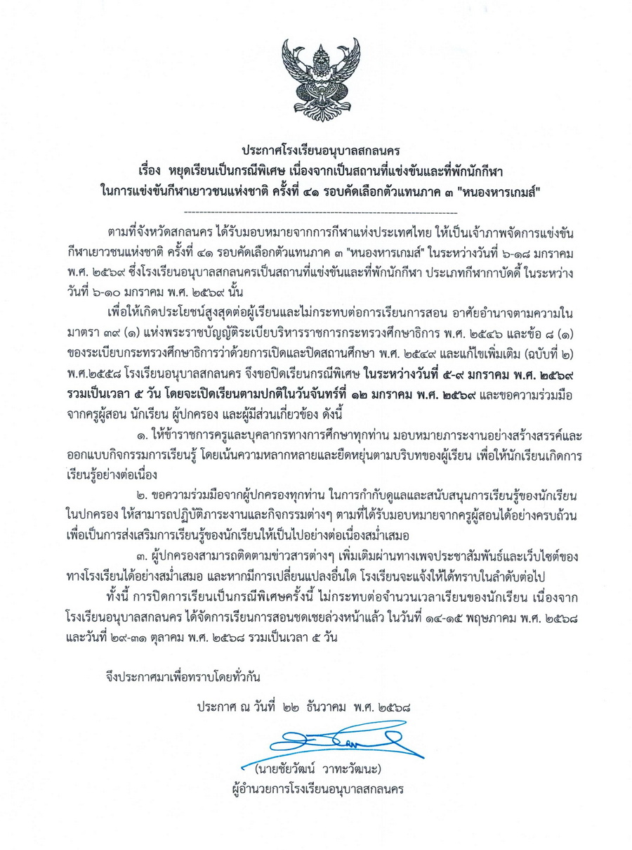 ประกาศโรงเรียนอนุบาลสกลนคร หยุดเรียนเป็นกรณีพิเศษ