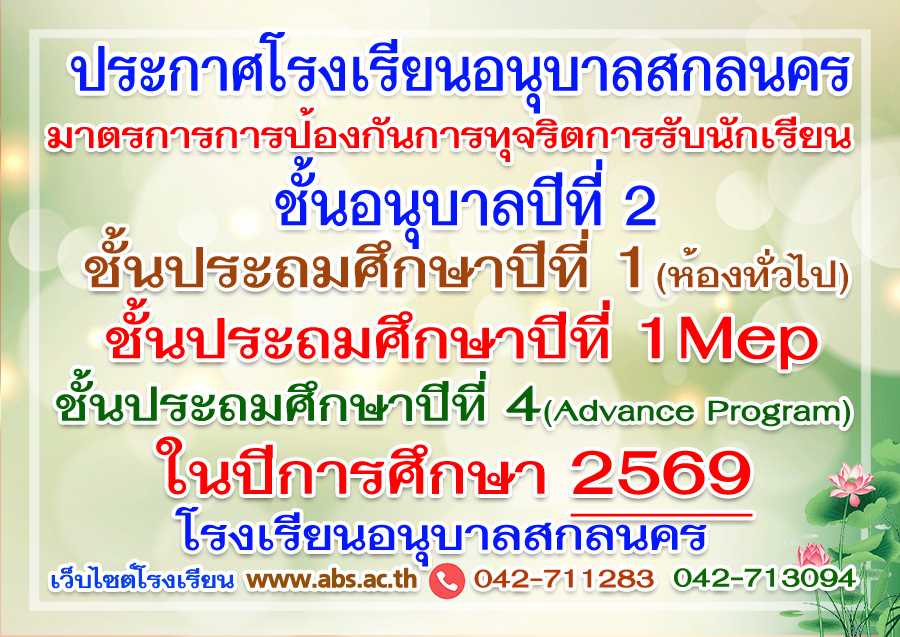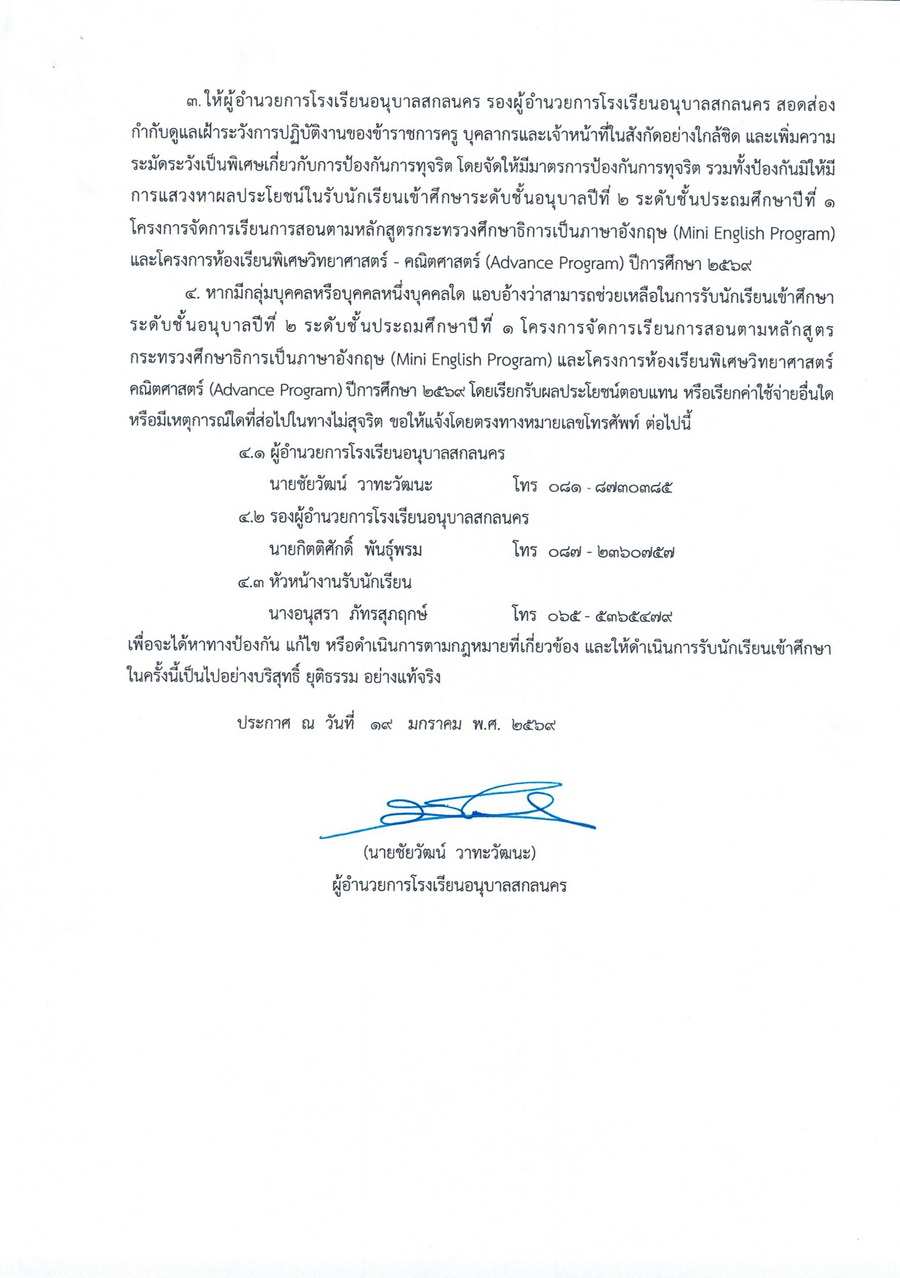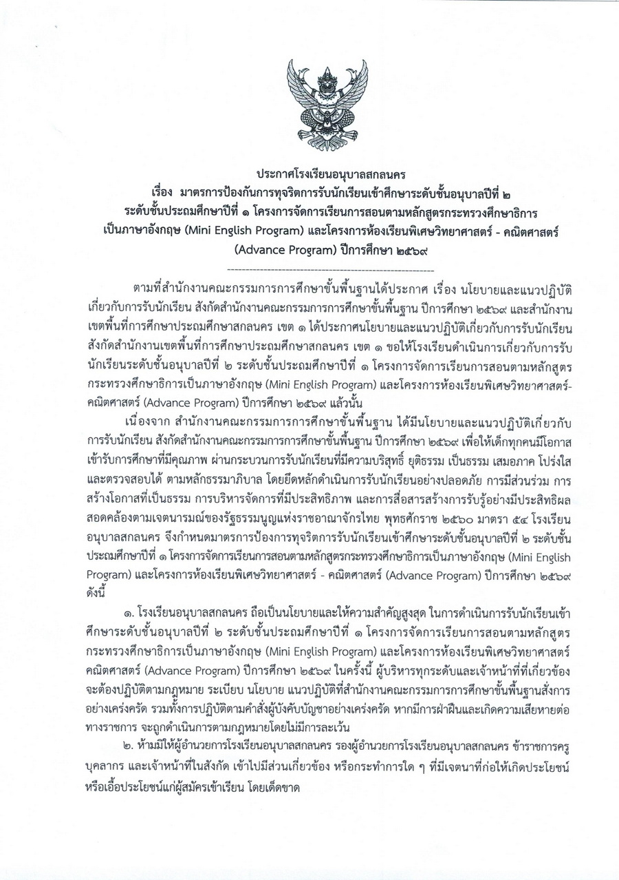 ประกาศมาตรการป้องกันการทุจริตการรับนักเรียนโรงเรียนอนุบาลสกลนคร