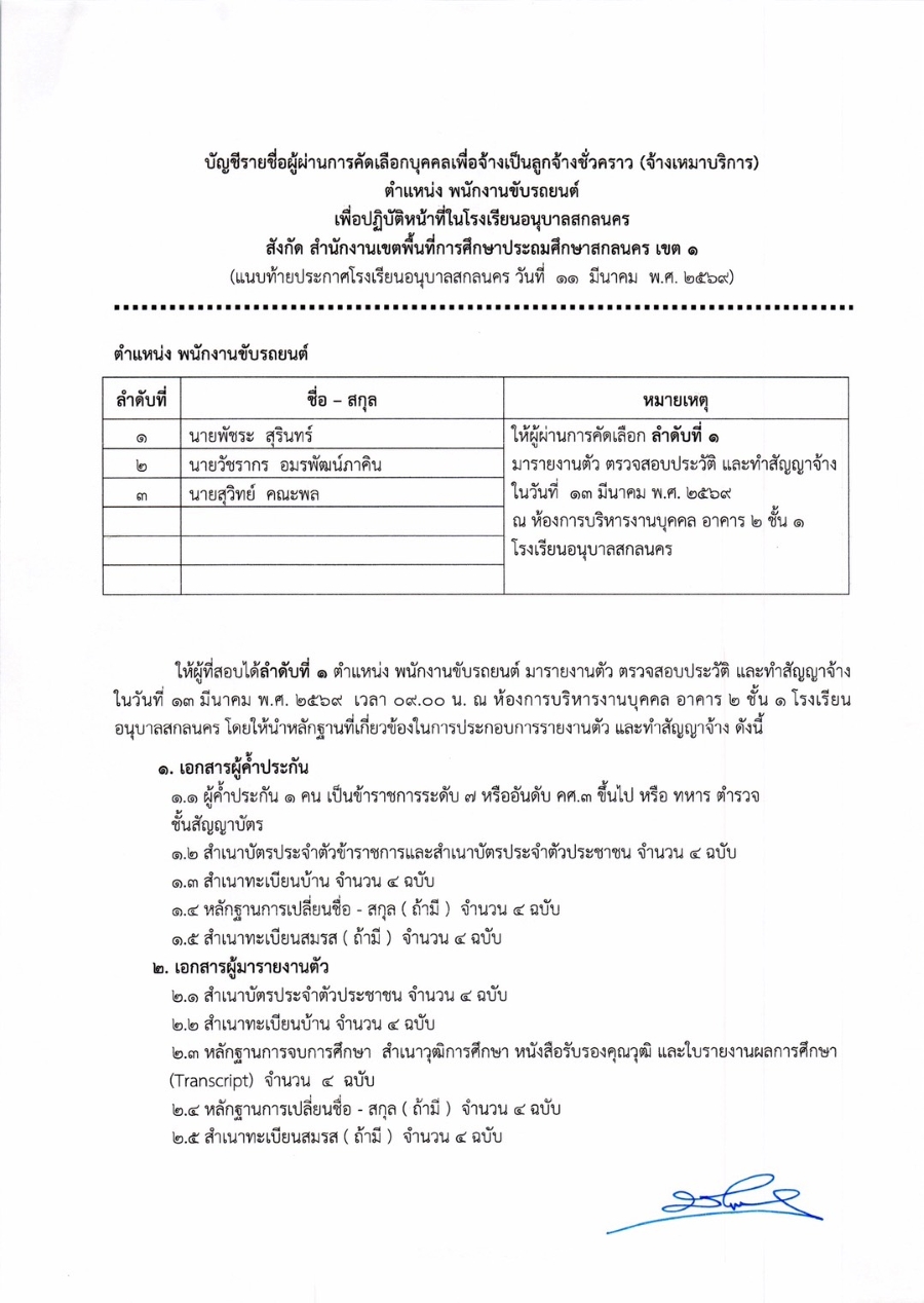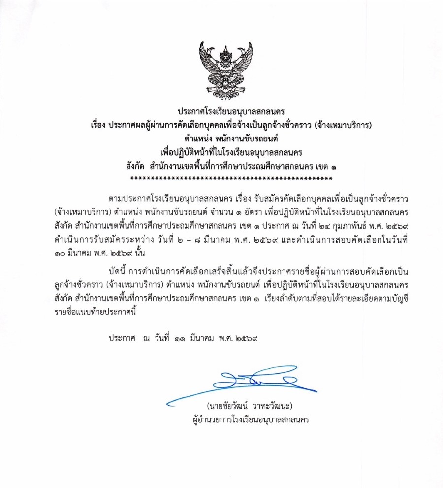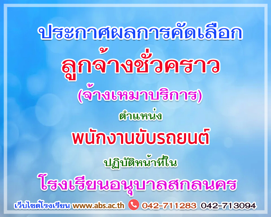 ประกาศผลการคัดเลือกบุคคลเพื่อเป็นลูกจ้างชั่วคราว ตำแหน่งพนักงานขับรถยนต์