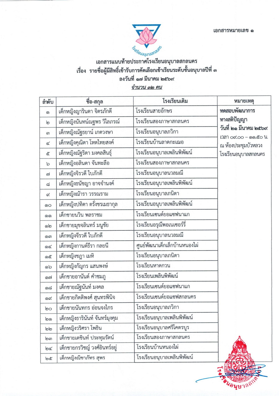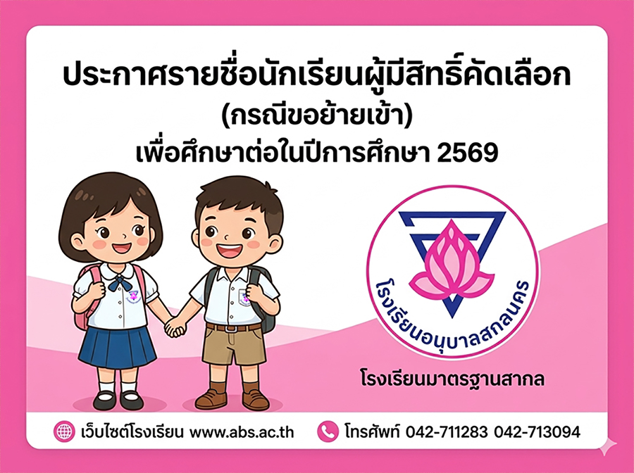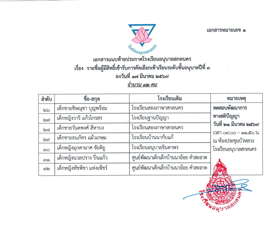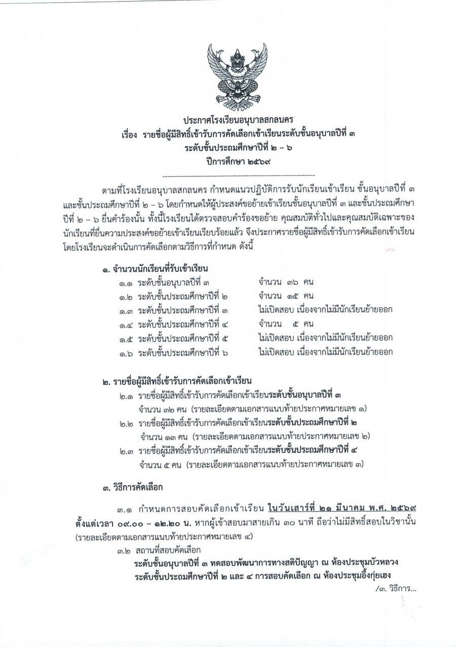 ประกาศรายชื่อผู้มีสิทธิ์รับคัดเลือกเข้าเรียนชั้นอนุบาลปีที่ 3 และชั้นประถมศึกษาปีที่ 2-6 ในปีการศึกษา 2569