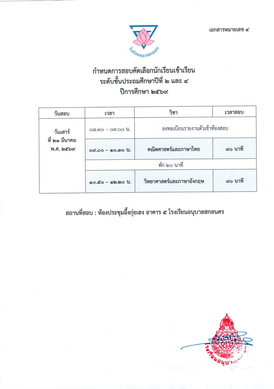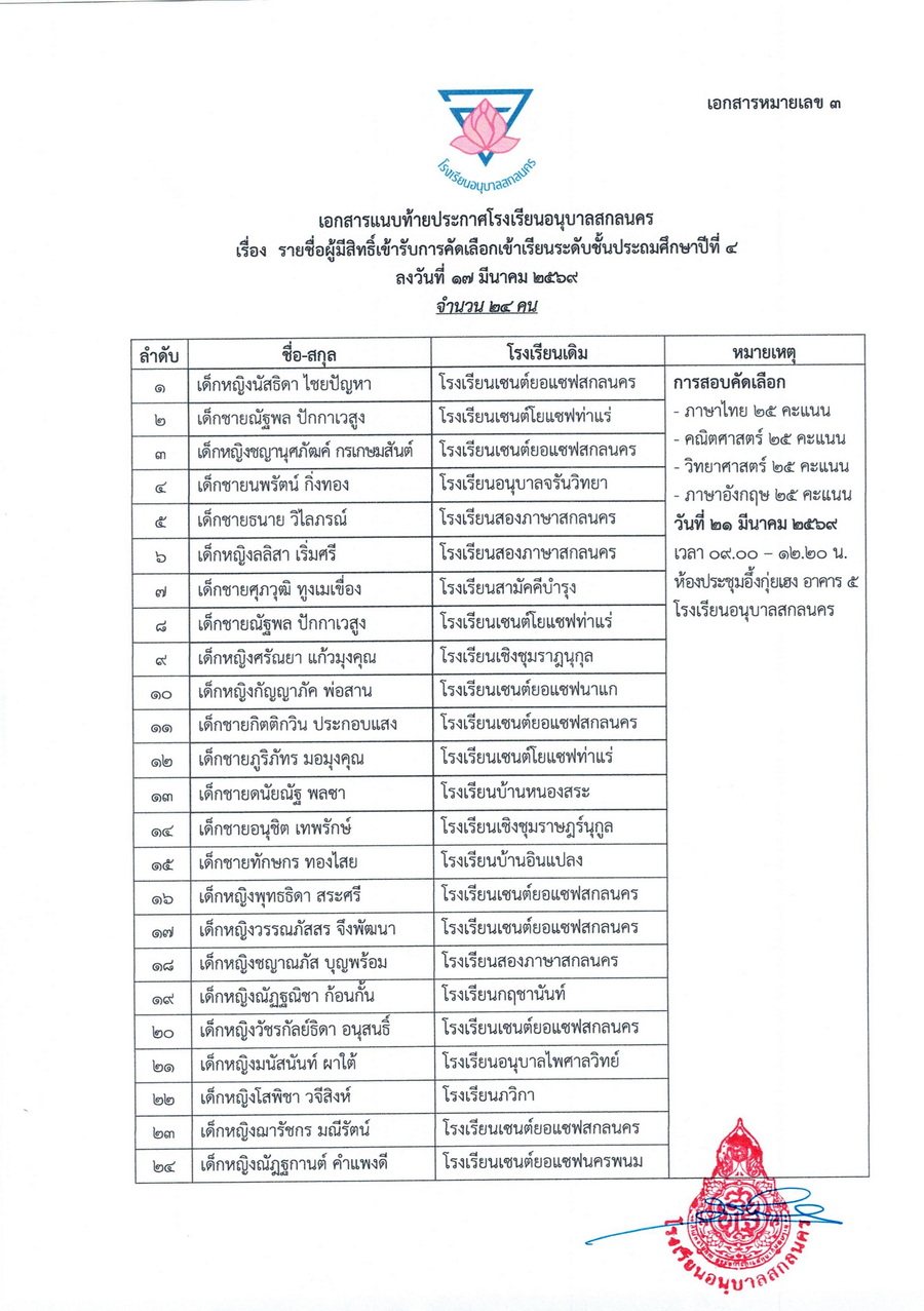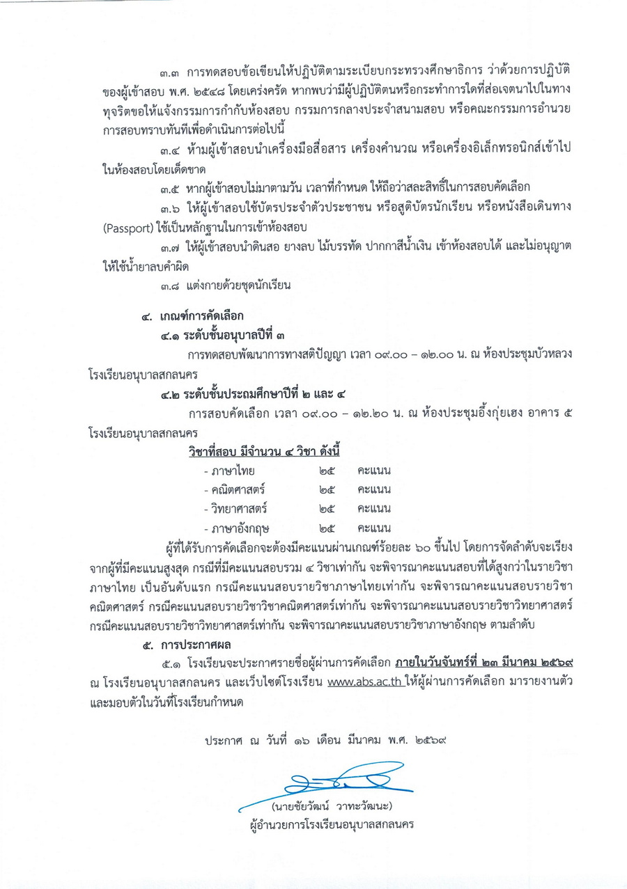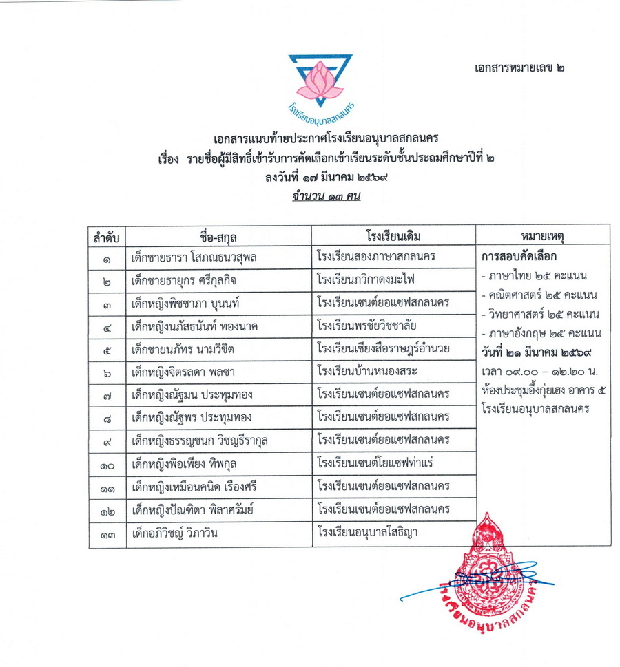 ประกาศรายชื่อผู้มีสิทธิ์รับคัดเลือกเข้าเรียนชั้นอนุบาลปีที่ 3 และชั้นประถมศึกษาปีที่ 2-6 ในปีการศึกษา 2569