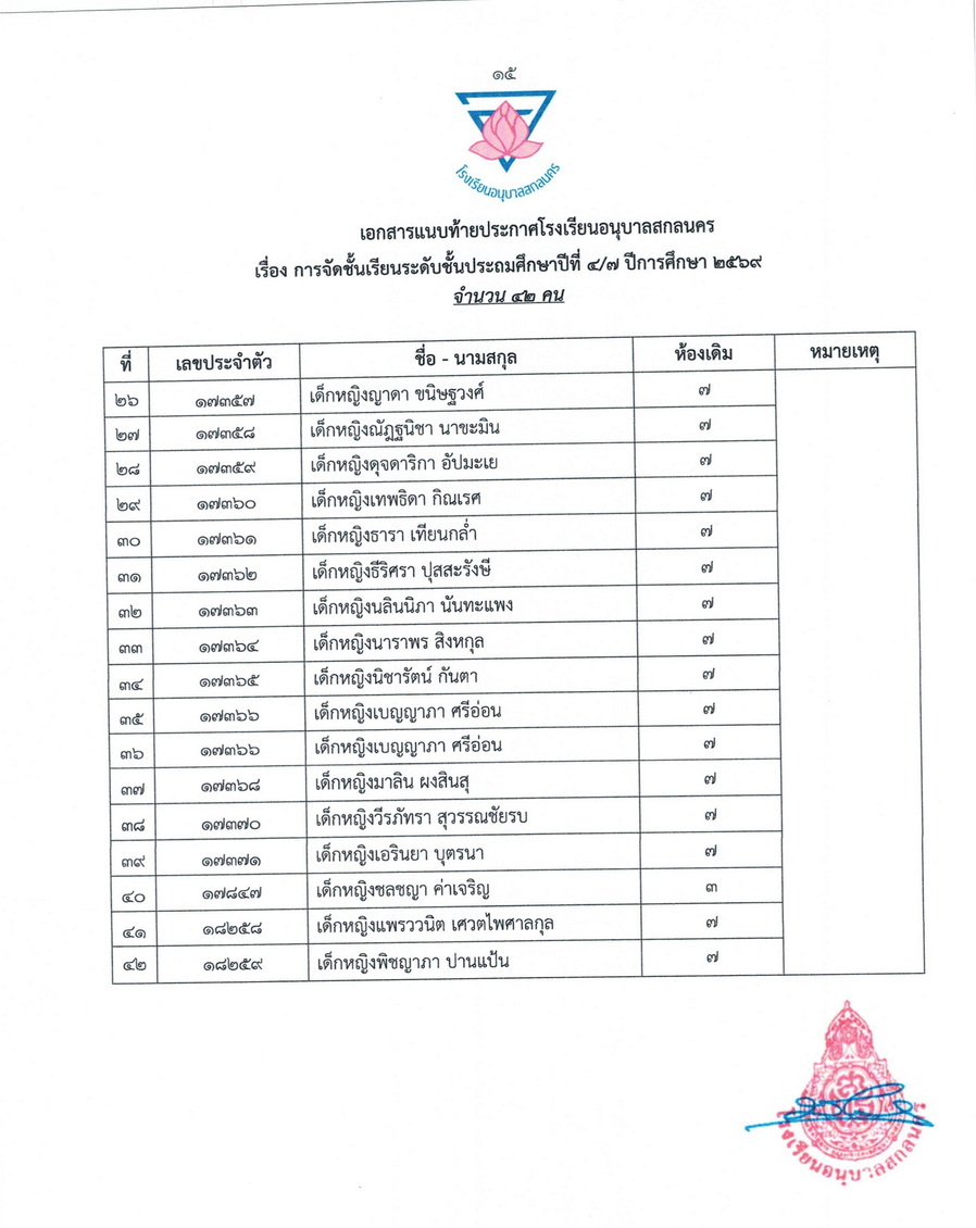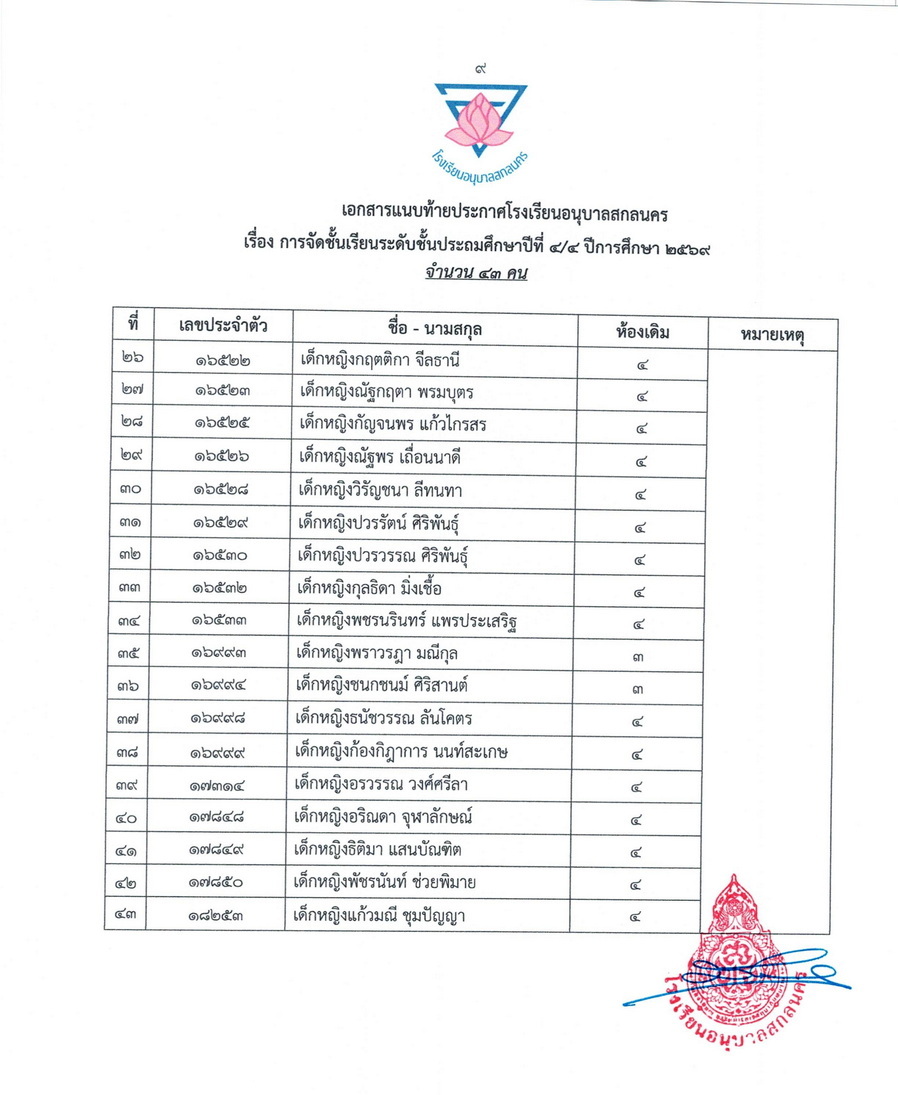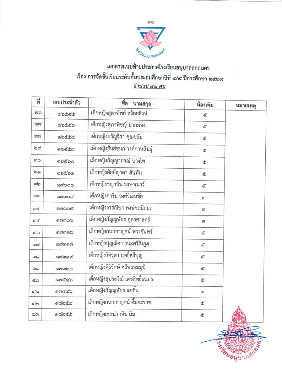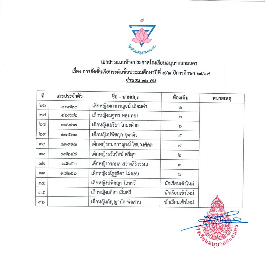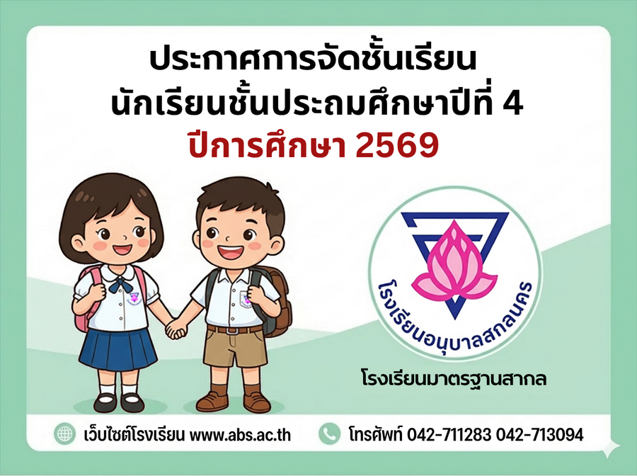 ประกาศการจัดชั้นเรียน นักเรียนชั้นประถมศึกษาปีที่ 4 ในปีการศึกษา 2569