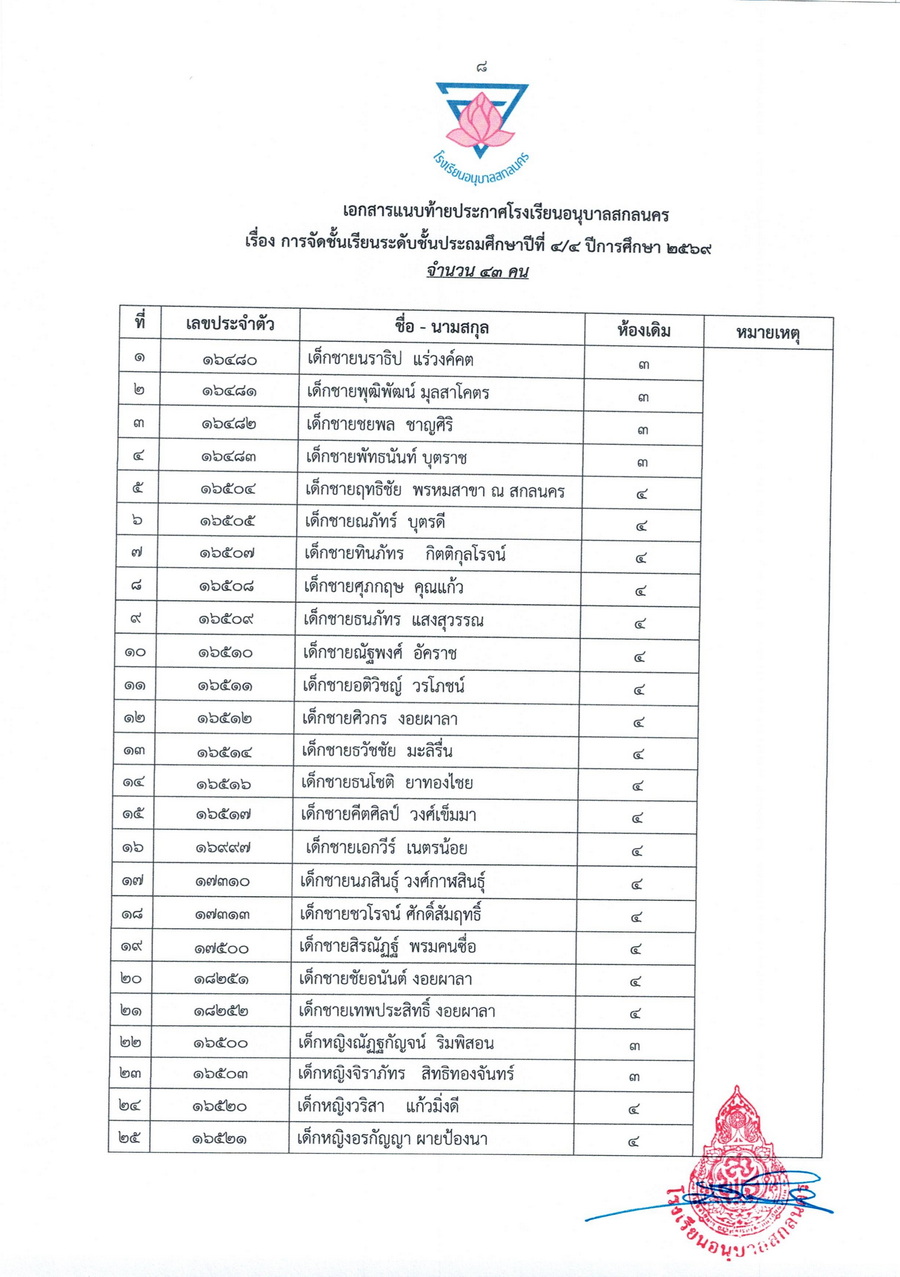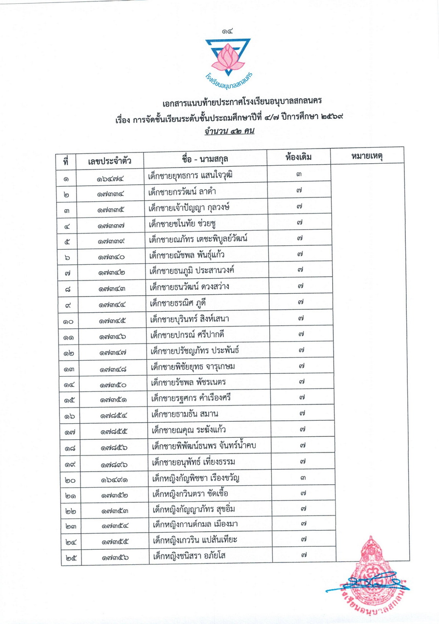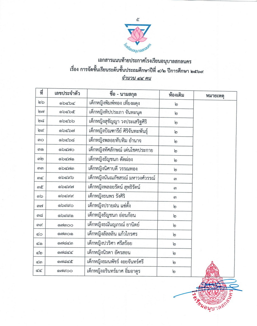 ประกาศการจัดชั้นเรียน นักเรียนชั้นประถมศึกษาปีที่ 4 ในปีการศึกษา 2569