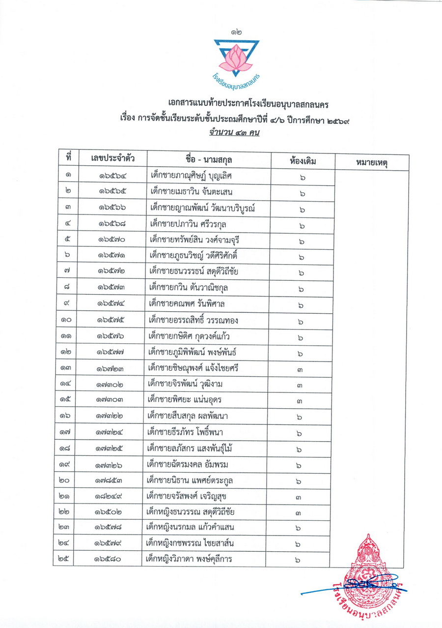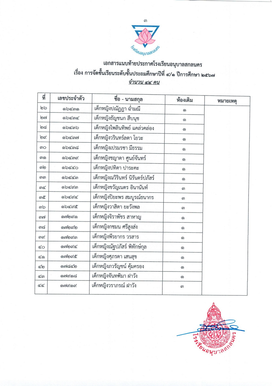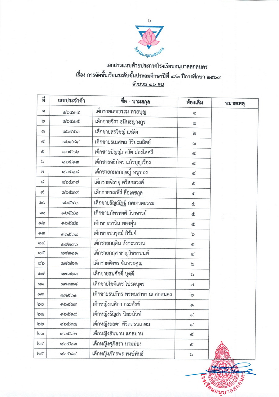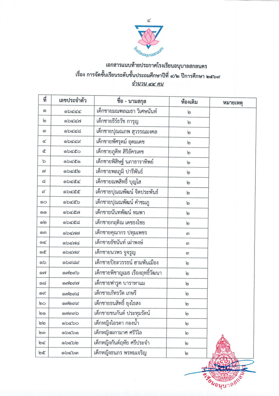 ประกาศการจัดชั้นเรียน นักเรียนชั้นประถมศึกษาปีที่ 4 ในปีการศึกษา 2569