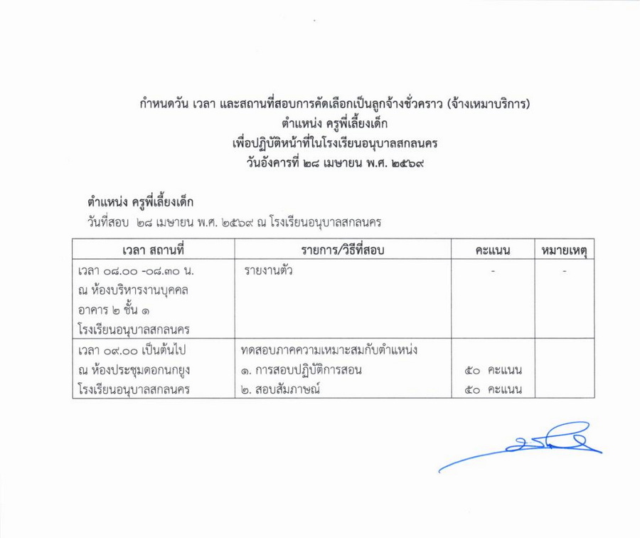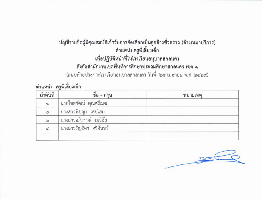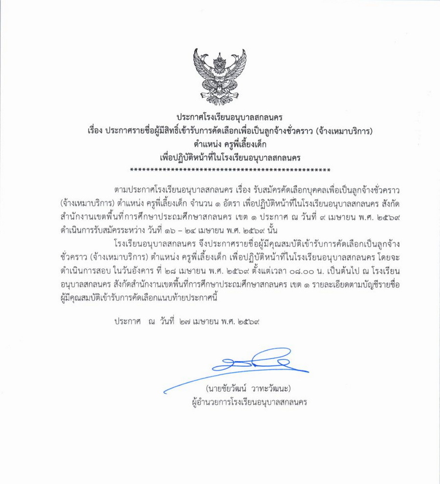 ประกาศรายชื่อผู้มีสิทธิ์รับการคัดเลือกเป็นลูกจ้างชั่วคราว ตำแหน่ง ครูพี่เลี้ยงเด็ก โรงเรียนอนุบาลสกลนคร