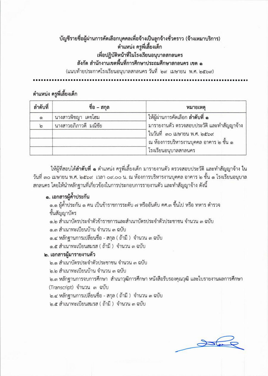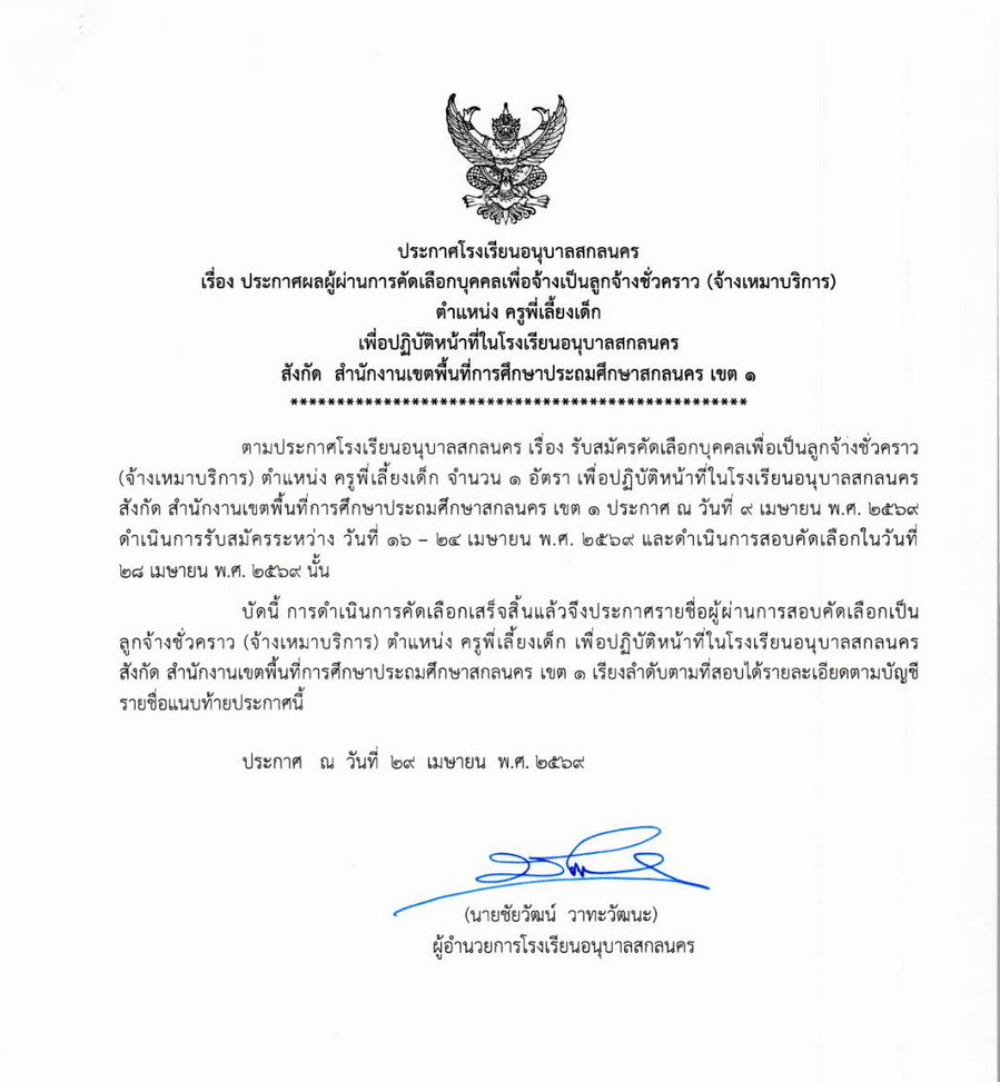 ประกาศผลการคัดเลือกลูกจ้างชั่วคราว ตำแหน่ง ครูพี่เลี้ยงเด็ก โรงเรียนอนุบาลสกลนคร