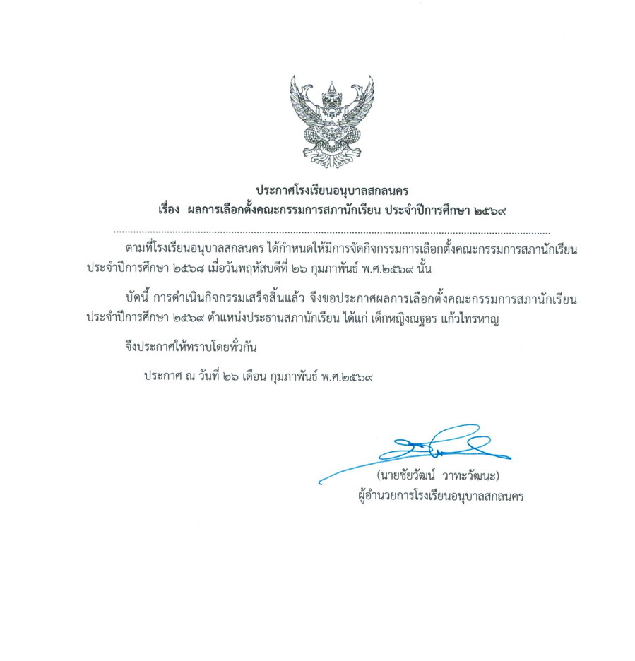 ผลการเลือกตั้งคณะกรรมการสภานักเรียน ปีการศึกษา 2569 ขอแสดงความยินดีกับ เด็กหญิงณฐอร แก้วไทรหาญ ตำแหน่งประธานสภานักเรียนโรงเรียนอนุบาลสกลนคร