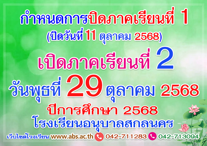 กำหนดการปิดภาคเรียนที่ 1 และเปิดภาคเรียนที่ 2 ปีการศึกษา 2568 โรงเรียนอนุบาลสกลนคร