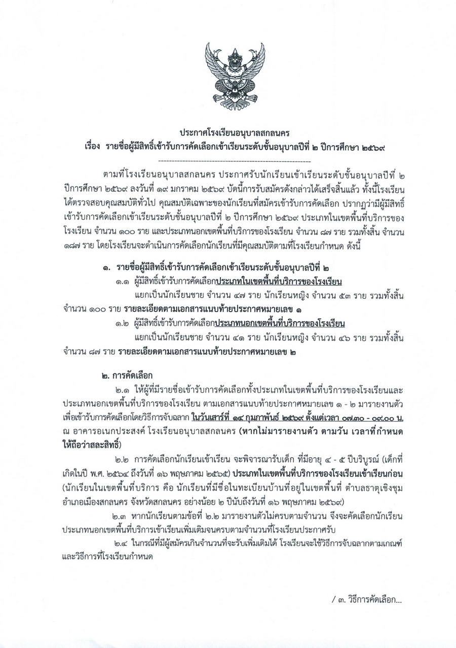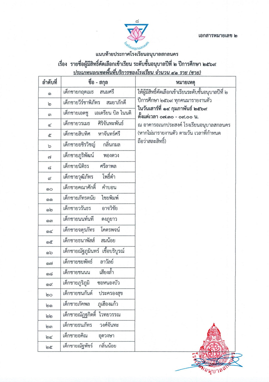 ประกาศรายชื่อผู้มีสิทธิ์ รับการคัดเลือกเข้าเรียนชั้นอนุบาลปีที่ 2 ปีการศึกษา 2569
